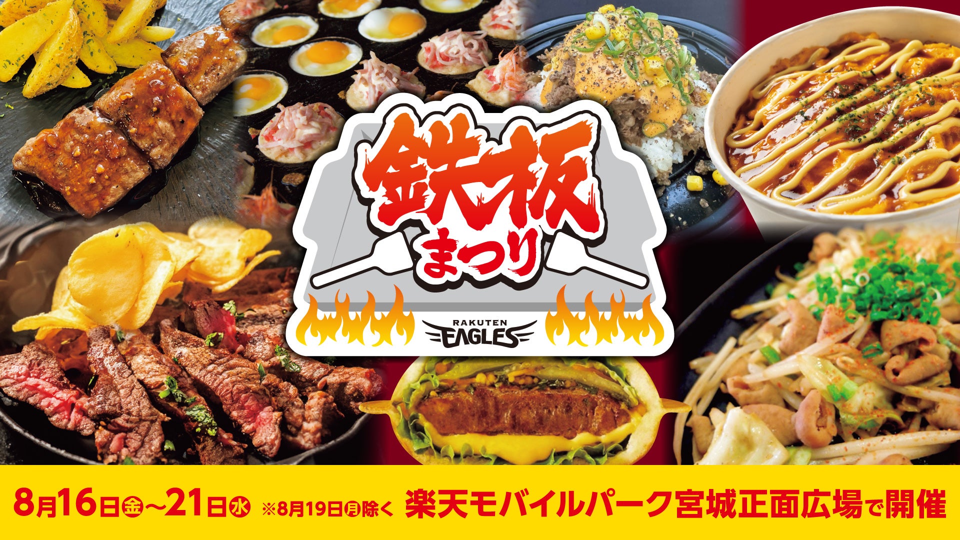株式会社楽天野球団(本社:宮城県仙台市宮城野区、代表取締役社長:森井 誠之)は、8月16日(金)から21日(水)の5日間(※19日を除く)で、楽天モバイルパーク宮城 正面広場にて鉄板を使ったグルメが楽しめる『鉄板まつり』を初めて開催することとなりましたので、お知らせいたします。