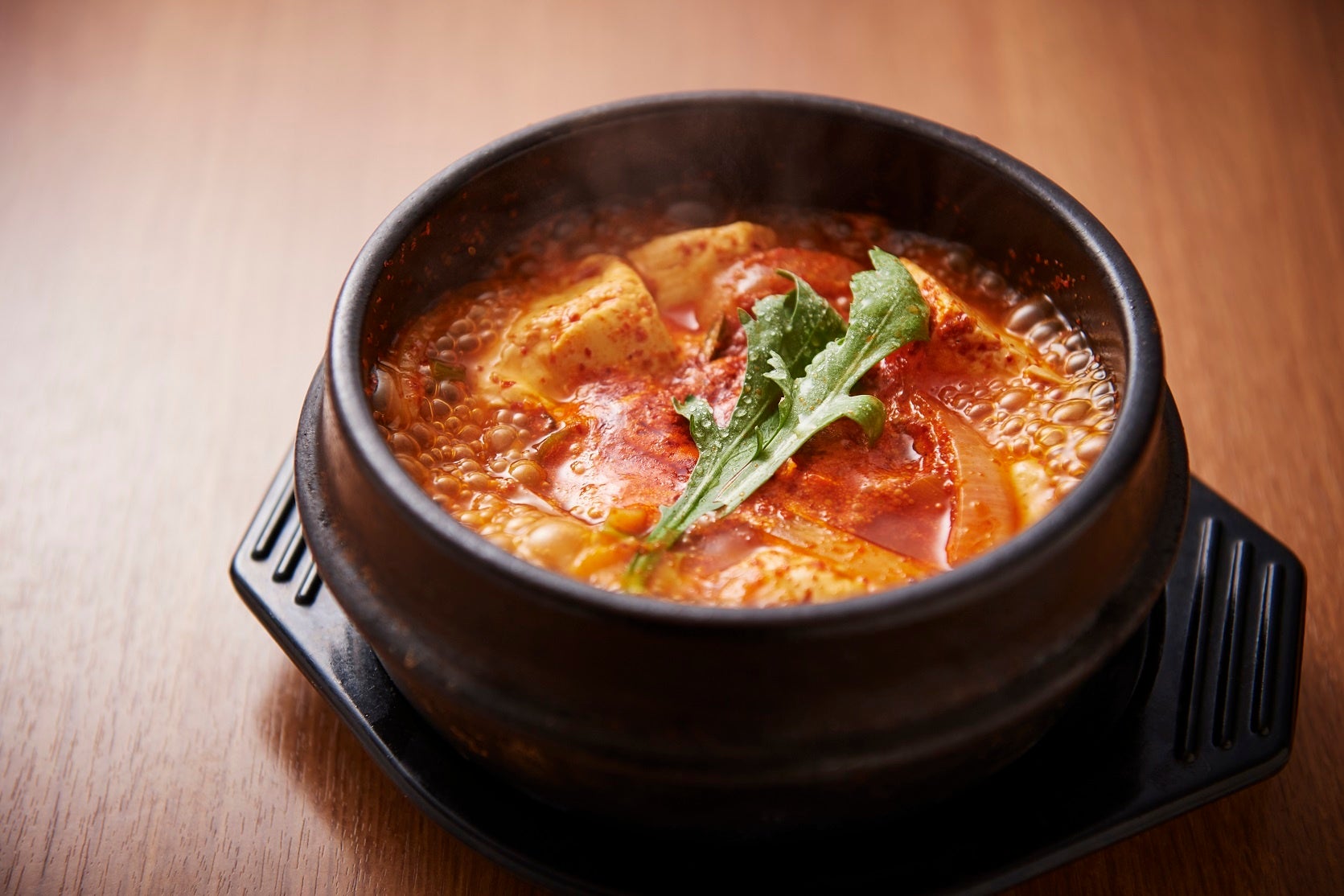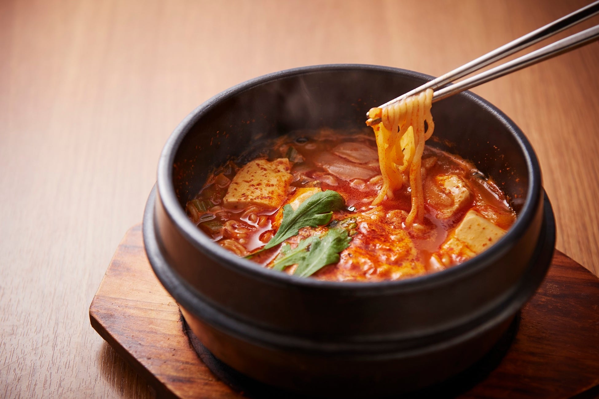 ピリッと辛いスンドゥブとラーメンスンドゥブは辛さが0~5段階でお選びいただけます。大阪府産の春菊の香りも合わせてお楽しみください。