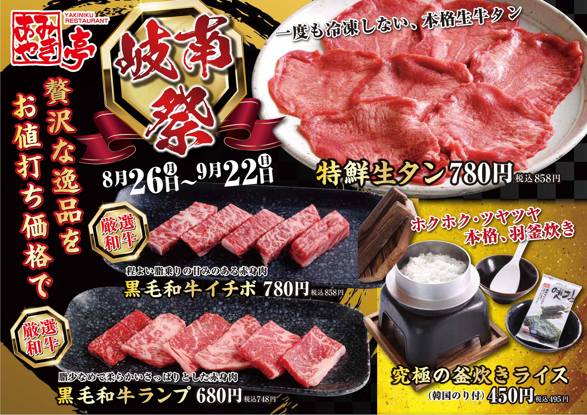 株式会社あみやき亭(本社:愛知県春日井市/代表取締役社長:宮崎 卓也)が中部地区81店舗を展開する国産牛焼肉「あみやき亭」の岐南店が、8/26(月)~9/22(日)『岐南祭』を開催いたします。