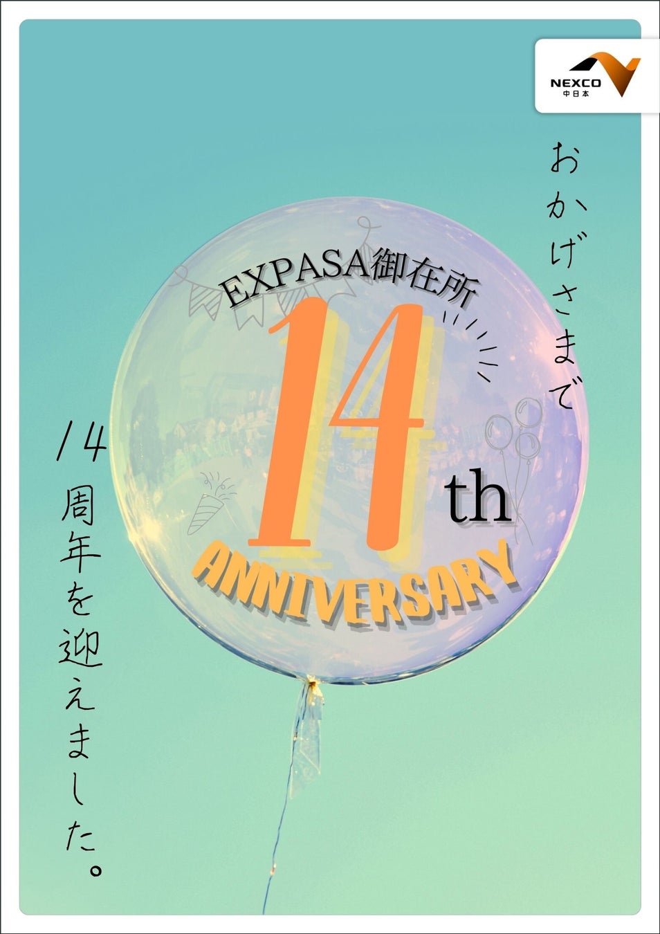 中日本エクシス株式会社 三重支店(三重県四日市市鵜の森、支店長・山本(やまもと) 武司(たけし))は、E23 東名阪自動車道(東名阪道) EXPASA御在所(上下、三重県四日市市)にて、開業14周年を記念し、お客さまへ日ごろのご愛顧に感謝を込めて、「EXPASA御在所14周年感謝祭」を開催します。