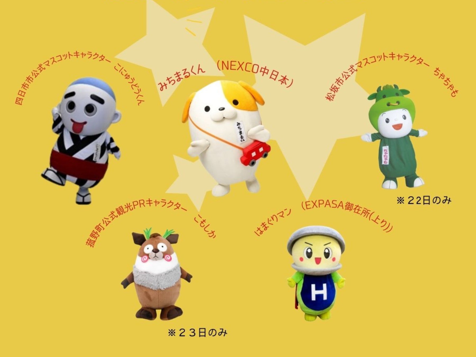 四日市市公式マスコットキャラクター「こにゅうどうくん」、松阪市公式マスコットキャラクター「ちゃちゃも」、菰野町観光PRキャラクター「こもしか」、NEXCO中日本オリジナルキャラクター「みちまるくん」、EXPASA御在所(上り)マスコットキャラクター「はまぐりマン」が登場。