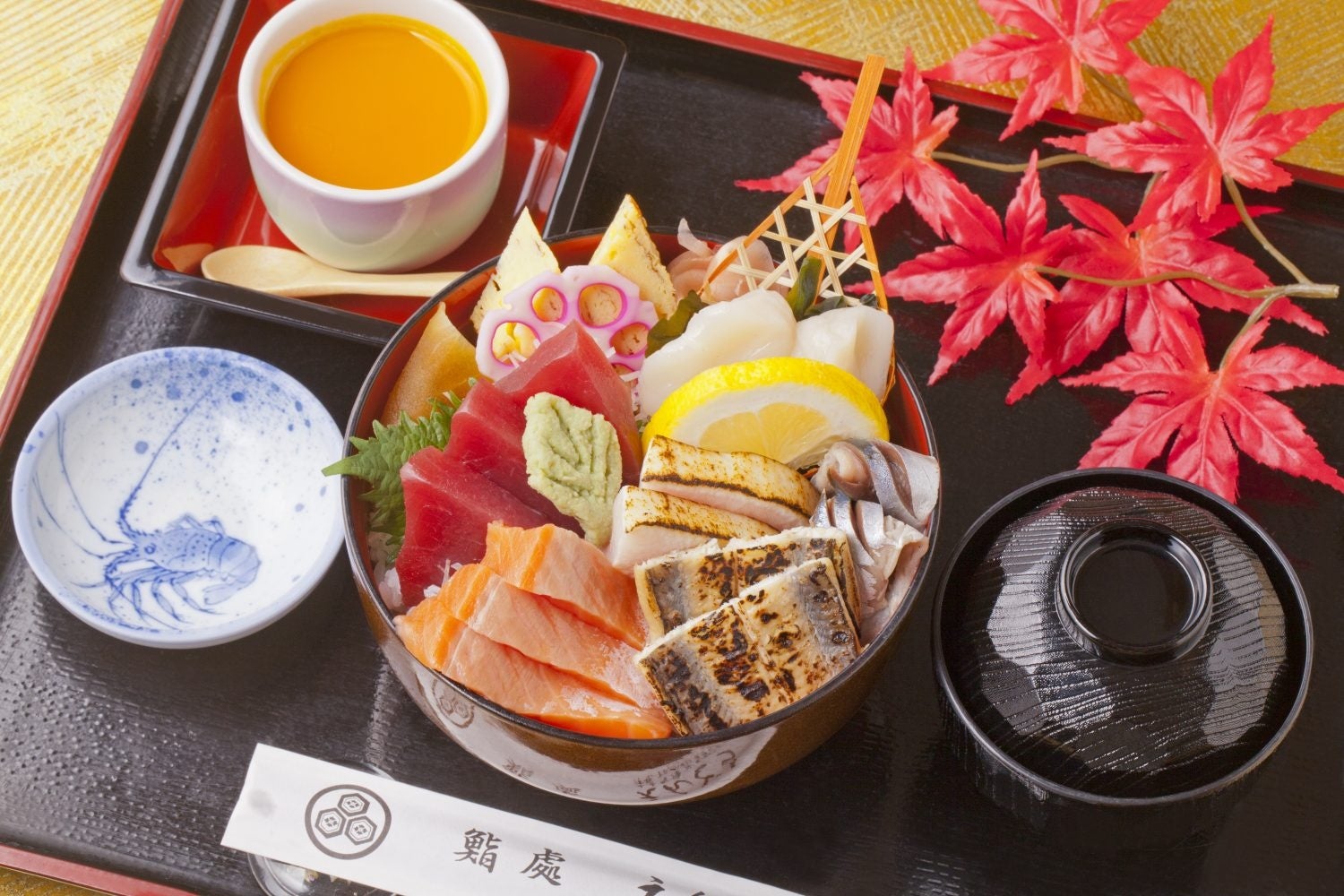 焼き帆立、焼き鮭、タコ唐、マグロなど豊富な食材で仕上げています。地元の秋の食材をぜひ味わってください。