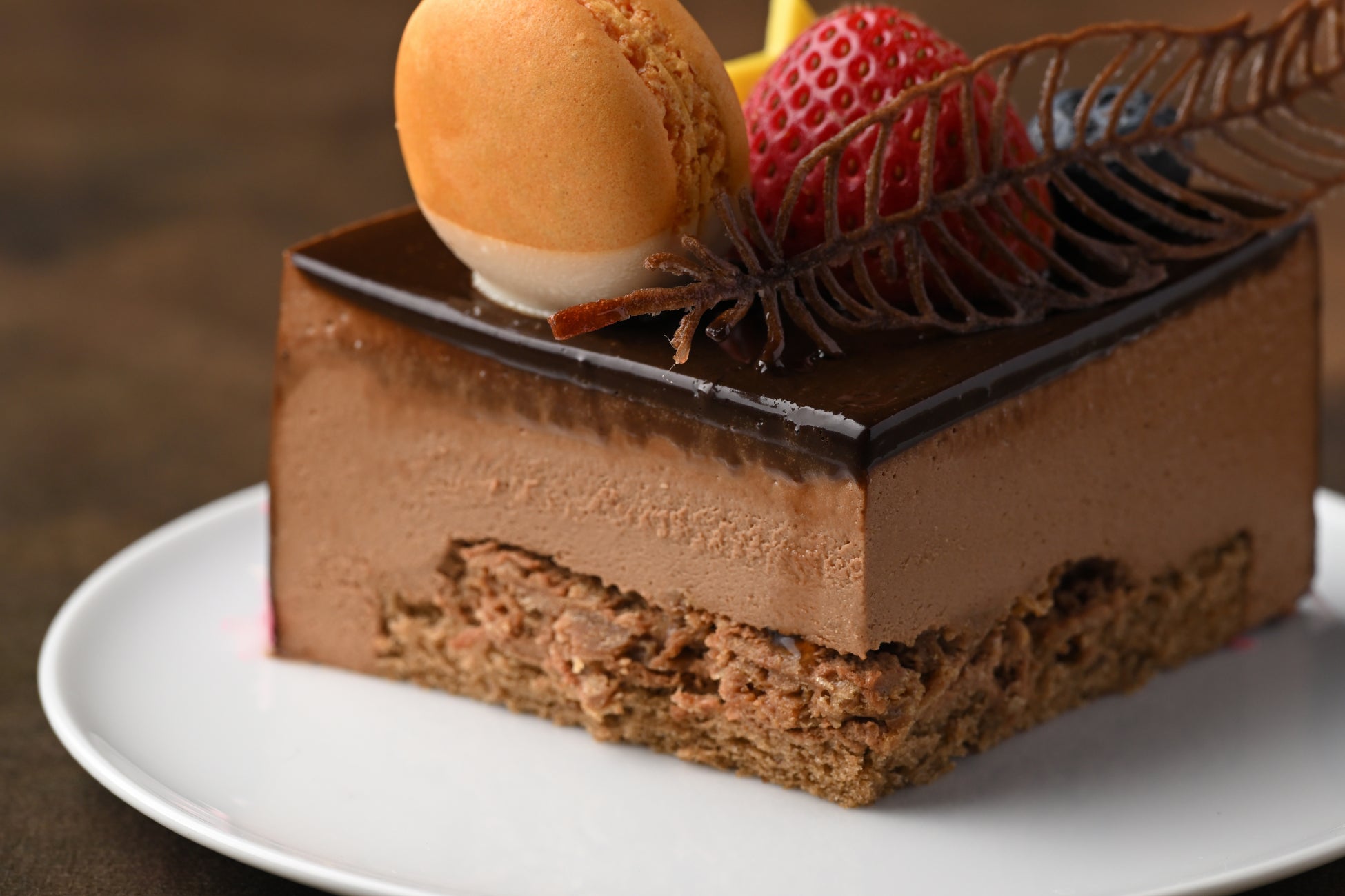 サクサクした 食感のクランキーチョコレートを混ぜてビターに仕上げたココアのスポンジケーキをフランス産チョコレート の ショコラムースで包みました。