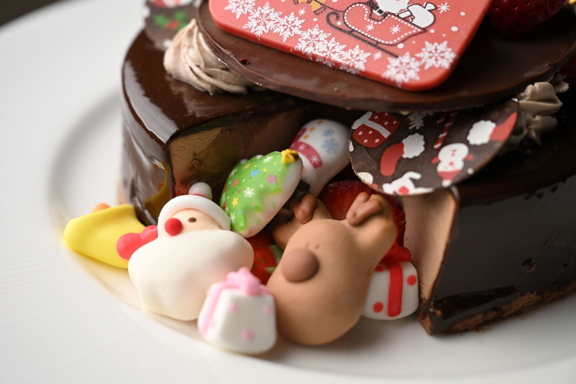 2024年の新作。キャラメルバナナのムースを忍ばせたココア風味のスポンジ生地とフランス産のチョコレートを使用したショコラムースのケーキ。あふれだすマジパンのクリスマスアイテムに、ケーキボックスを開けた瞬間の歓声が聞こえてきそうです。