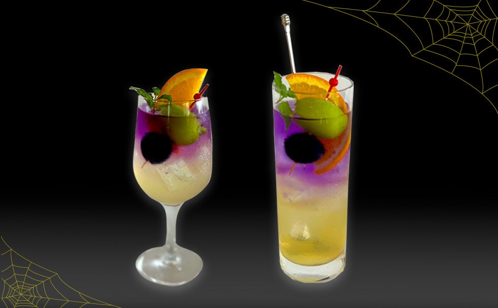 レモンシロップの甘酸っぱさとスパークリングワインの爽やかさが絶妙に調和。仕上げに、ハロウィンカラーのオレンジスライスとブドウを添えて。トニックウォーターで仕立てたノンアルコールもご用意。
