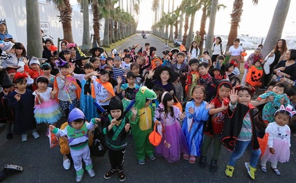 リビエラ逗子マリーナハロウィンイベントの目玉!たくさんの子どもたちが、お気に入りの衣装を着てリビエラ逗子マリーナや周辺の小坪エリアを巡ります。「トリック・オア・トリート」の合言葉で、地元の方々からお菓子をもらおう!