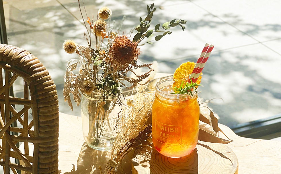 アールグレイティーに芳醇な桃のリキュール(ノンアルコールはピーチジュース)とローズシロップ、レモン果汁をブレンドし、マリブファームから見える美しいトワイライトに溶け込むような色合いに仕上げました。口に入れた瞬間、ピーチの甘さと紅茶のさっぱりとした味わいが広がる一杯。ほのかに香るアールグレイの柑橘とローズの香りはリラックス効果があり、日常の喧騒から離れ、ヤシ並木とマリーナを眺めながらリゾートを満喫するひとときに最適です。