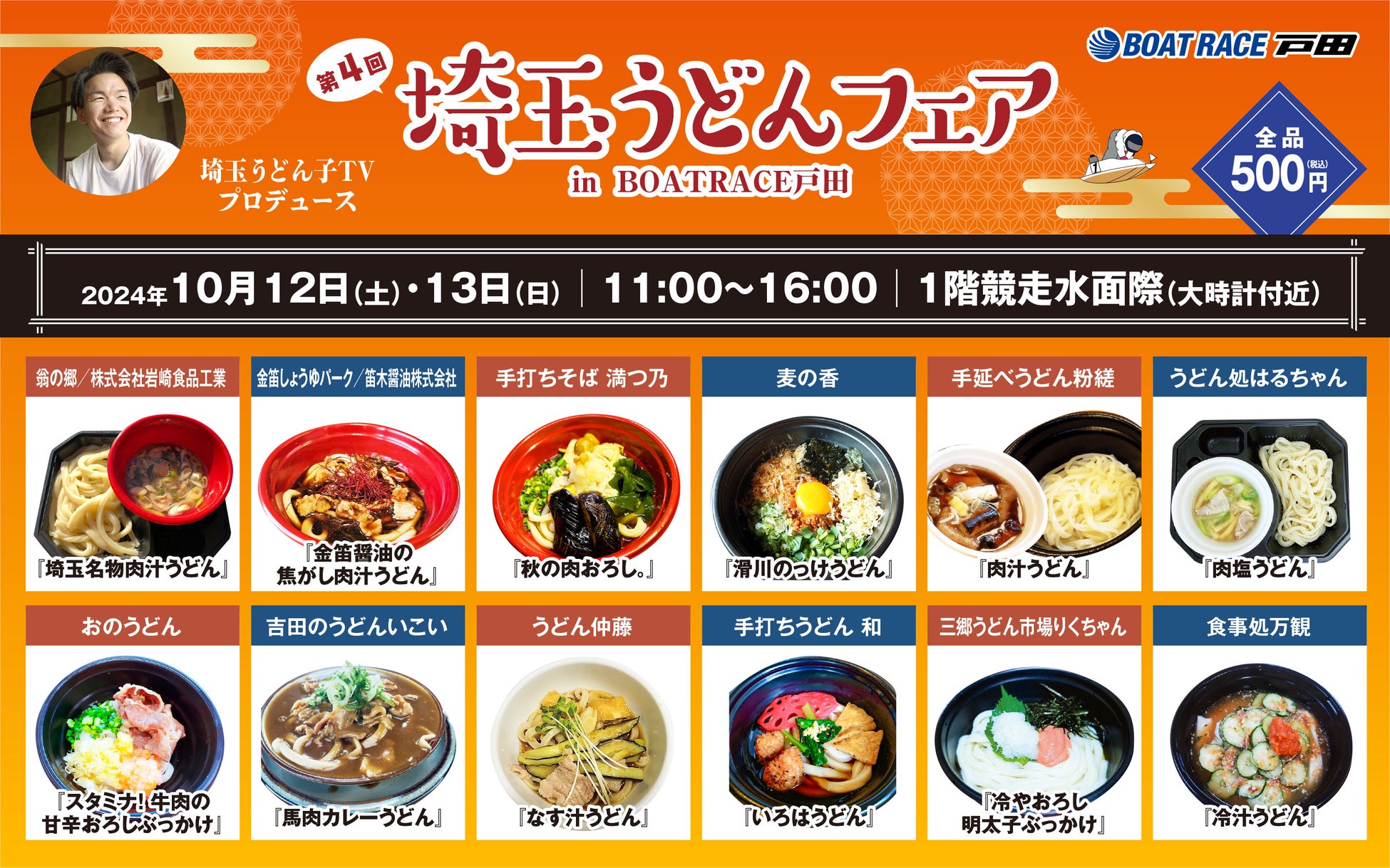 今回で第4回目となる「埼玉うどんフェア」は2024年10月12日(土)~10月13日(日)の2日間で12店舗が出店。開催場所はBOAT RACE戸田。ボートレースの競走を楽しみながら全品税込み500円で「味の競演」も楽しむことができます。