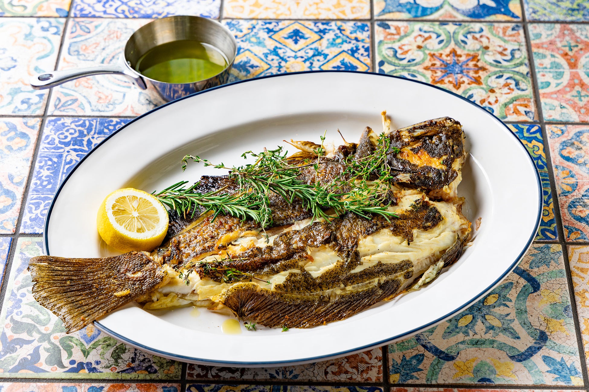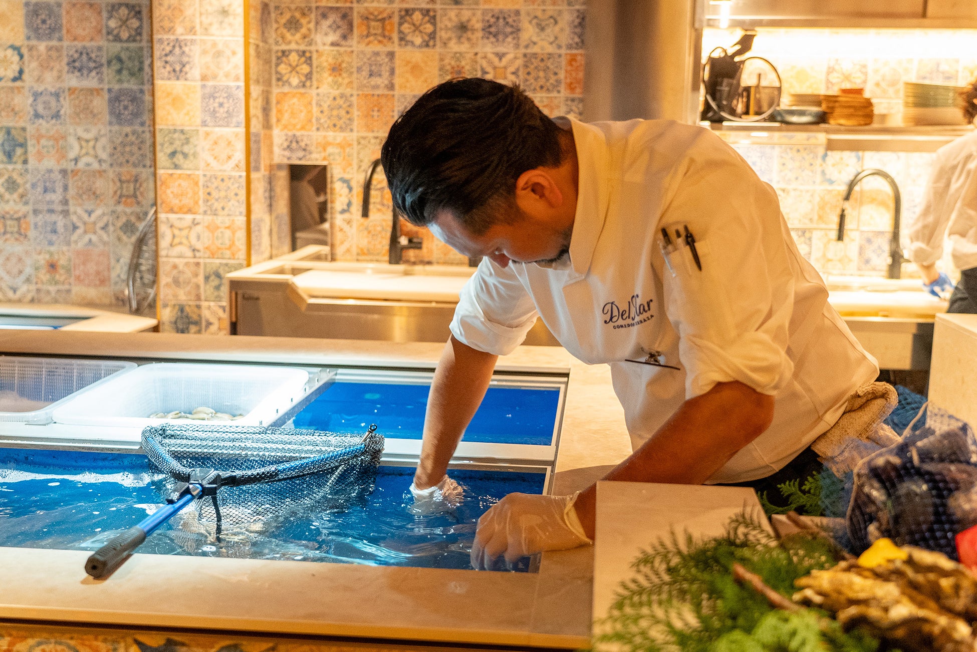 Del Mar(デルマール)のおすすめメニューはなんといってもシーフード!店舗入り口にはスペインタイルで装飾された、生け簀(いけす)がお出迎え。サザエや鮑、伊勢海老、ヒラメ、タコまで、横浜中央卸売市場の鮮魚店から仕入れた魚介が並びます。