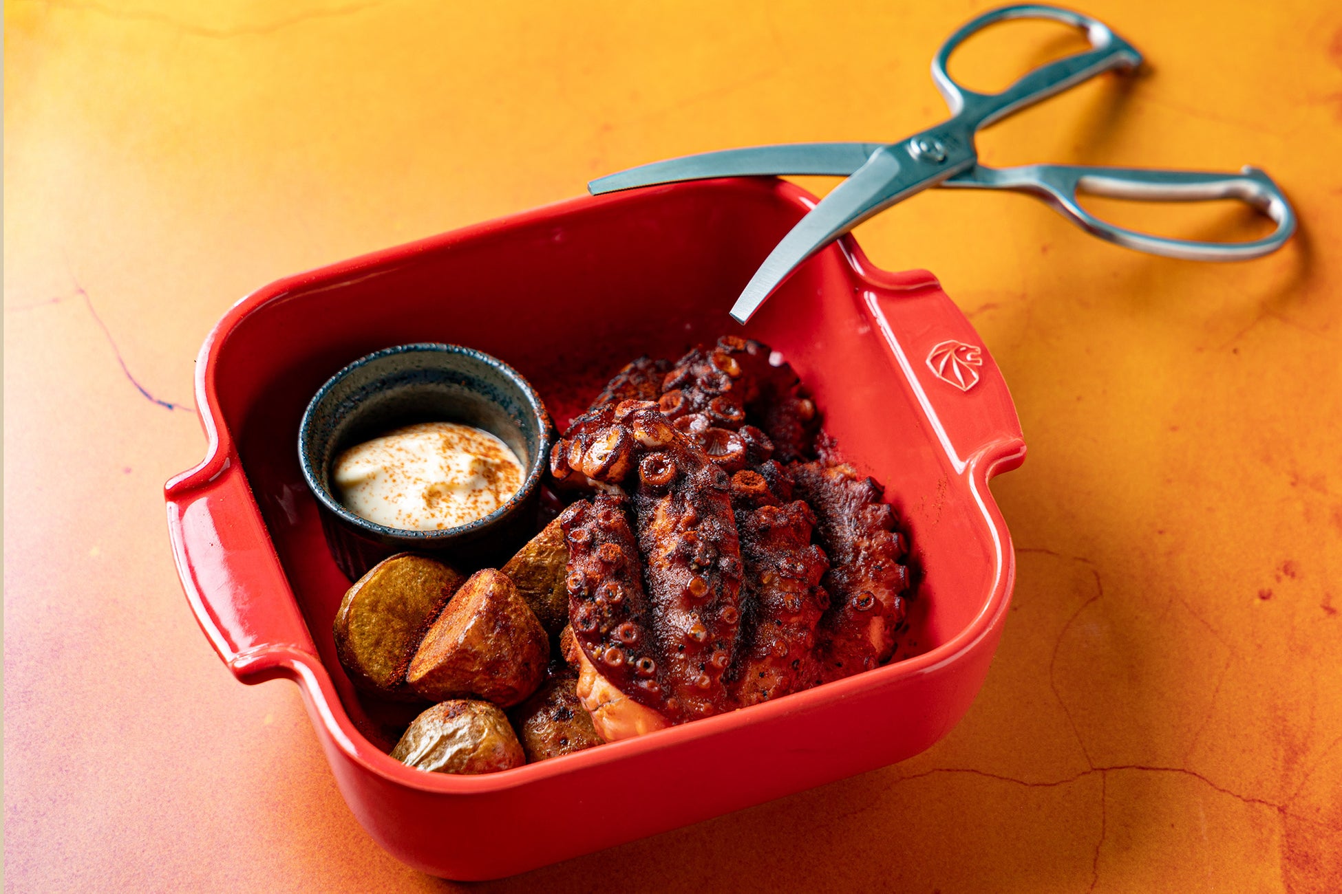 Pulpo=「タコ」 Vivo=「活・生きた」という名前の通り、生け簀の新鮮なテナガダコをビネガーやパセリ、玉ねぎを使ったさっぱりとした「チミチュリソース」と、旨味と香りのあるペースト状の唐辛子の調味料、アリッサ・アイオリで味付け。仕上げにレモンを絞ってお楽しみいただきます。踊り食いならではの弾力のある食感!