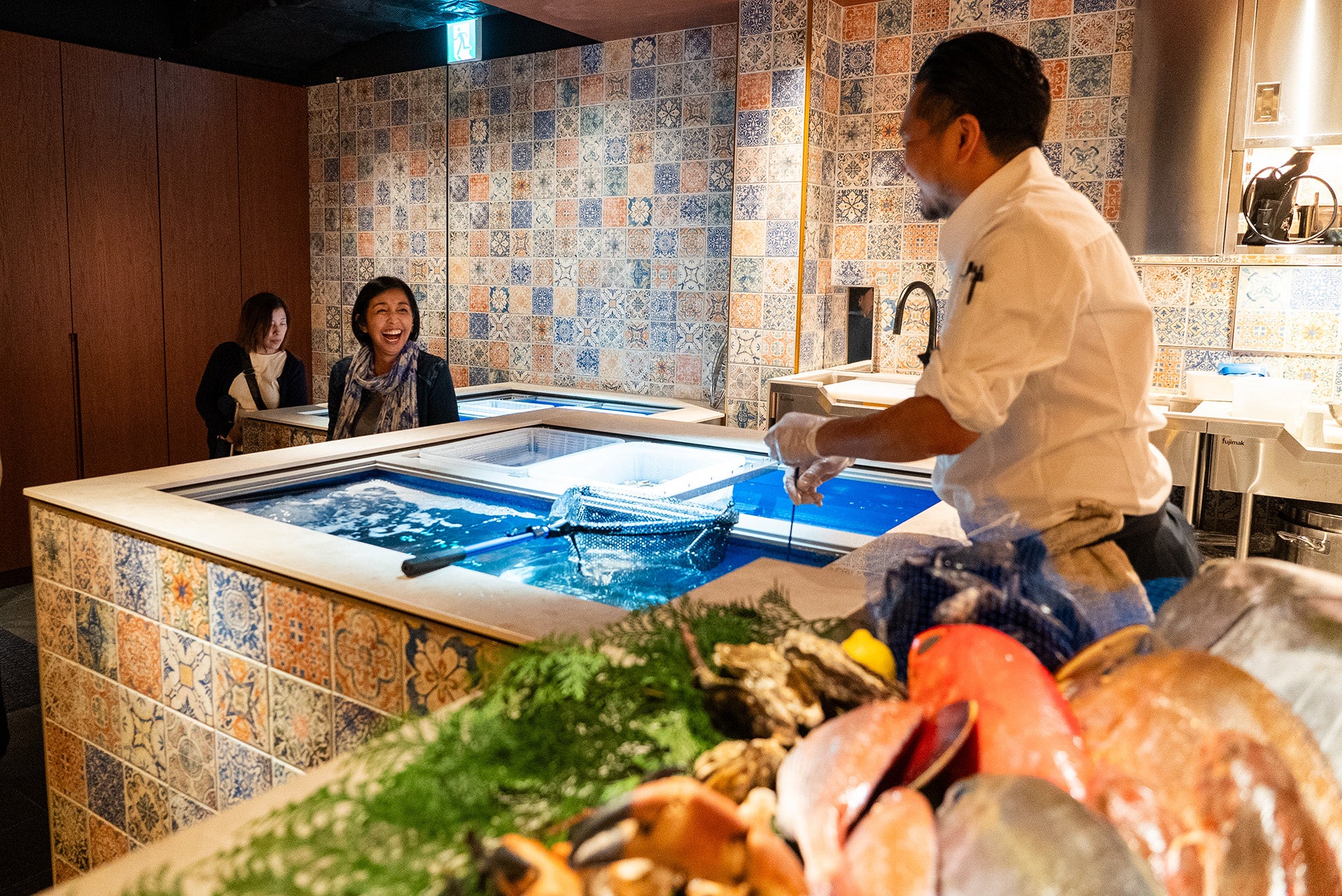 入り口には「生け簀(いけす)」がお出迎え!新鮮なシーフードが自慢のスペイン料理