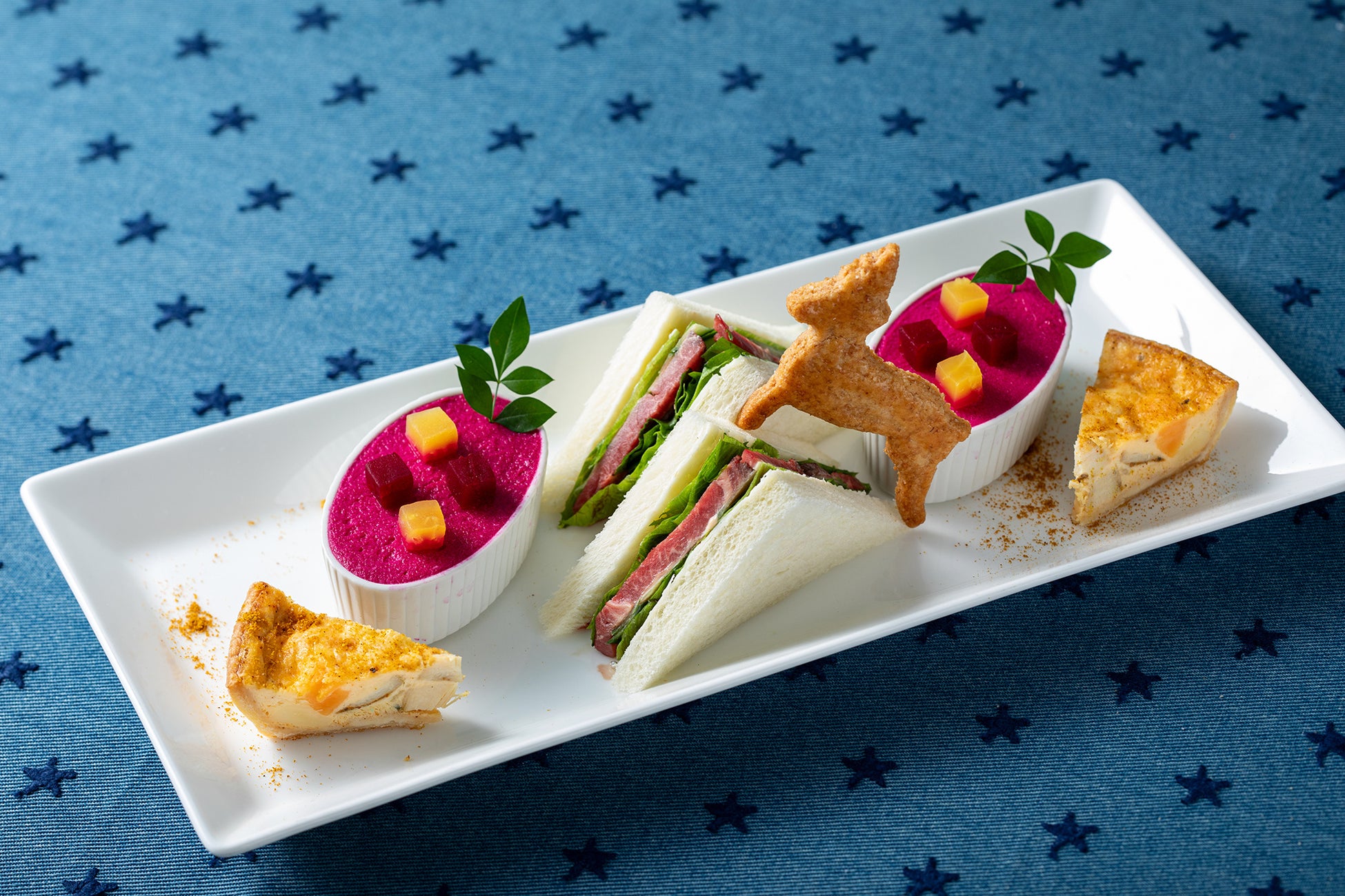 中段のセイボリーには、レフォールバターとマヨネーズを閉じ込めた“ローストビーフのサンドウィッチ”とクリスマスチキンのキッシュ、クリスマスカラーの“ビーツのムース”。