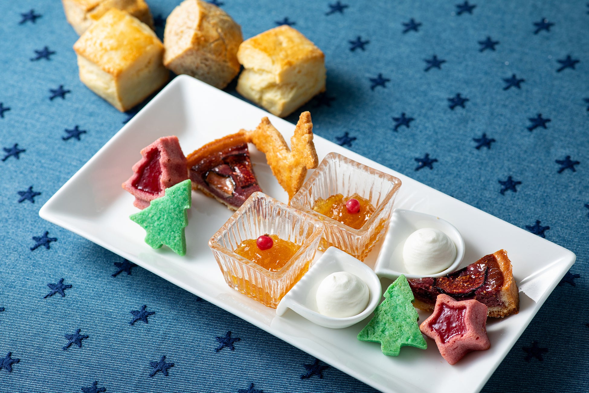 下段には、フランボワーズのアーモンドクリームが決め手の”イチジクとフランボワーズのタルト”や、可愛らしい”トナカイのサブレ”とツリーに飾るオーナメントをモチーフにした”フランボワーズのフィナンシェ”、別皿でご用意する2種類のスコーンと一緒にお楽しみいただく”オレンジメープルジャム“と”マスカルポーネクリーム“のラインアップで、年に一度のホリデーシーズンならではのワクワクを演出いたします。