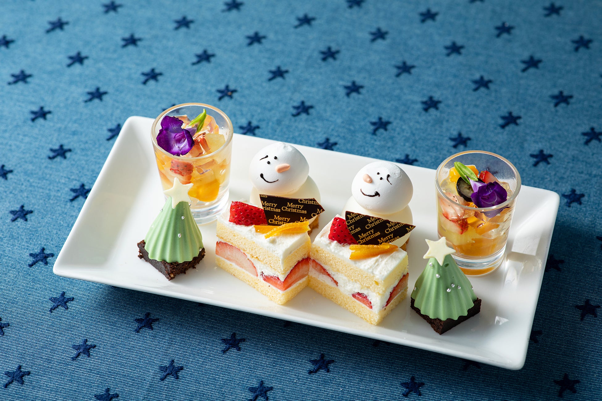 三段スタンドの上段には、”クリスマスツリーのピスタチオムース”や”スノーマンのフロマージュムース”、”苺のショートケーキ”、カラフルで味わい爽やかな“フルーツのジュレ”をご用意。