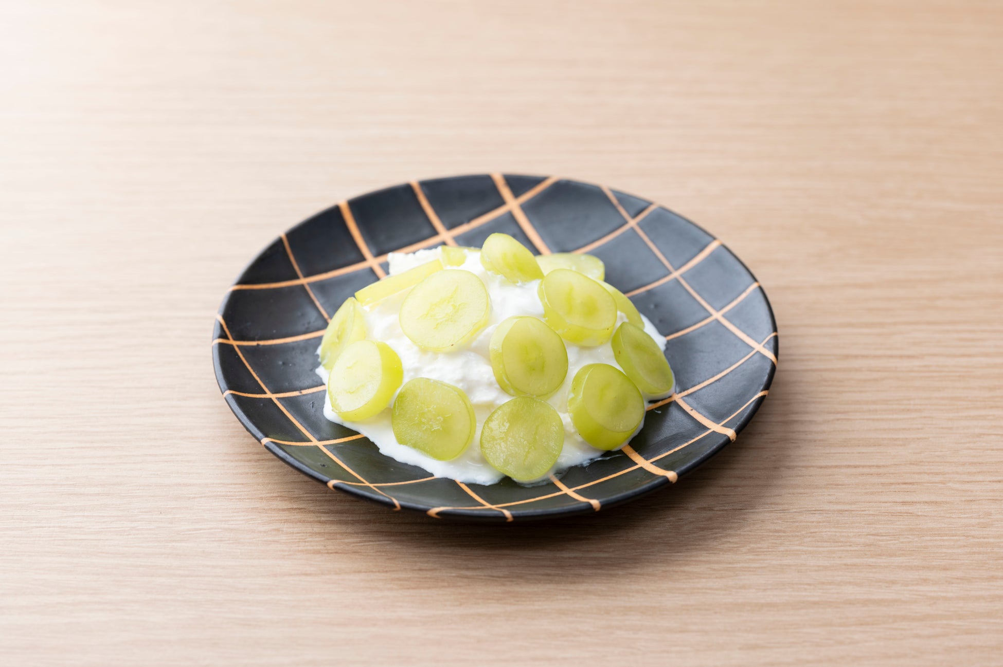 クラフトモッツァレラとパルテノを使用した、ブラータ風カプレーゼ。マスカットとモッツアレラの組み合わせが絶妙です。