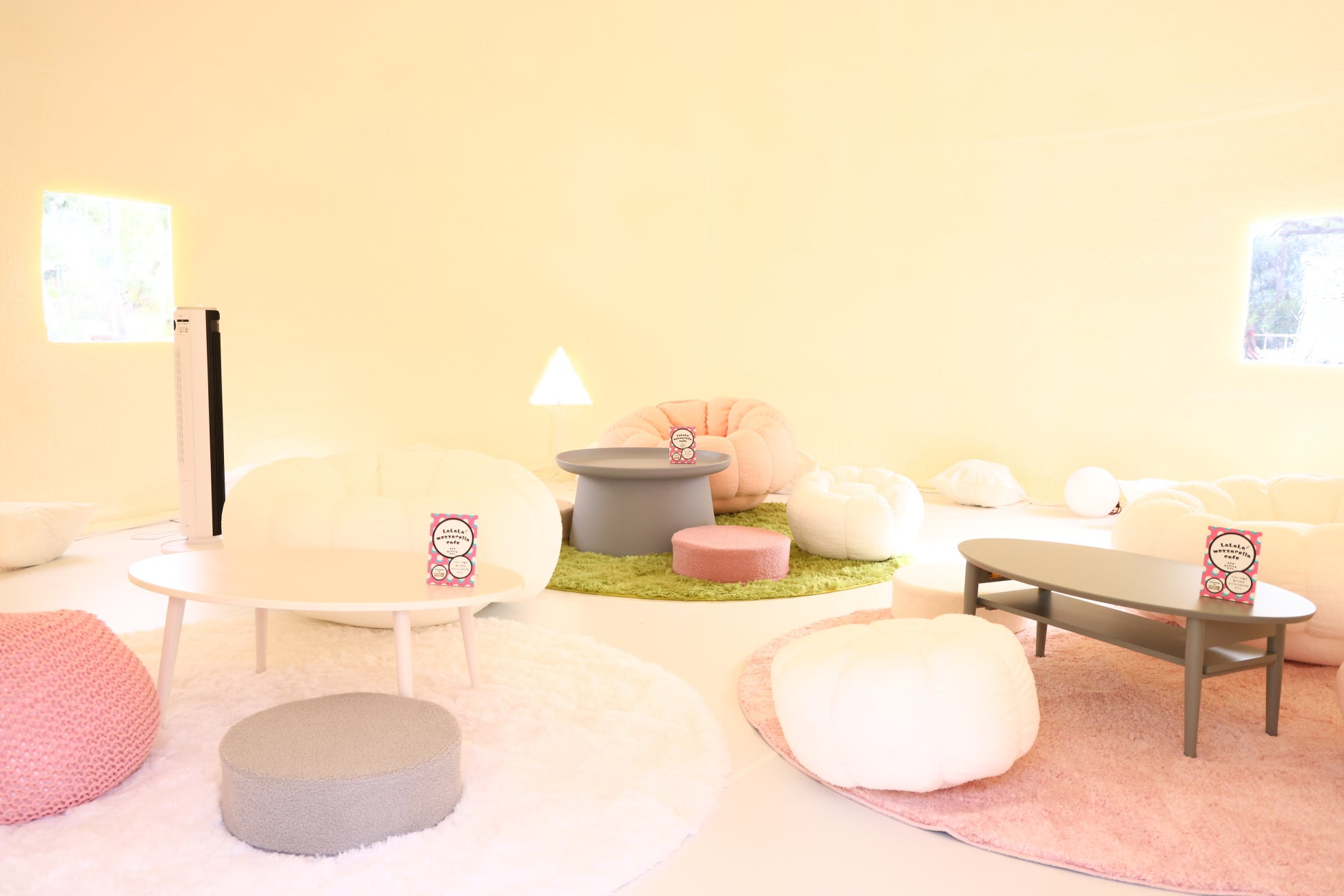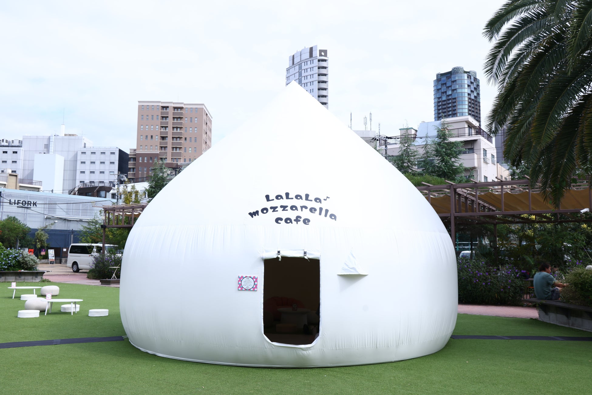 カフェの象徴となるのは、今回のために開発した「モッツァレラドーム」。ベースのインスタントハウスに丸みを持たせ、室内には可愛くて、もっちもち感のあるインテリアを揃えました。また、屋外にもモッツァレラをイメージしたインテリアを配置しており、個性的な空間のなかでメニューを楽しむことができます。