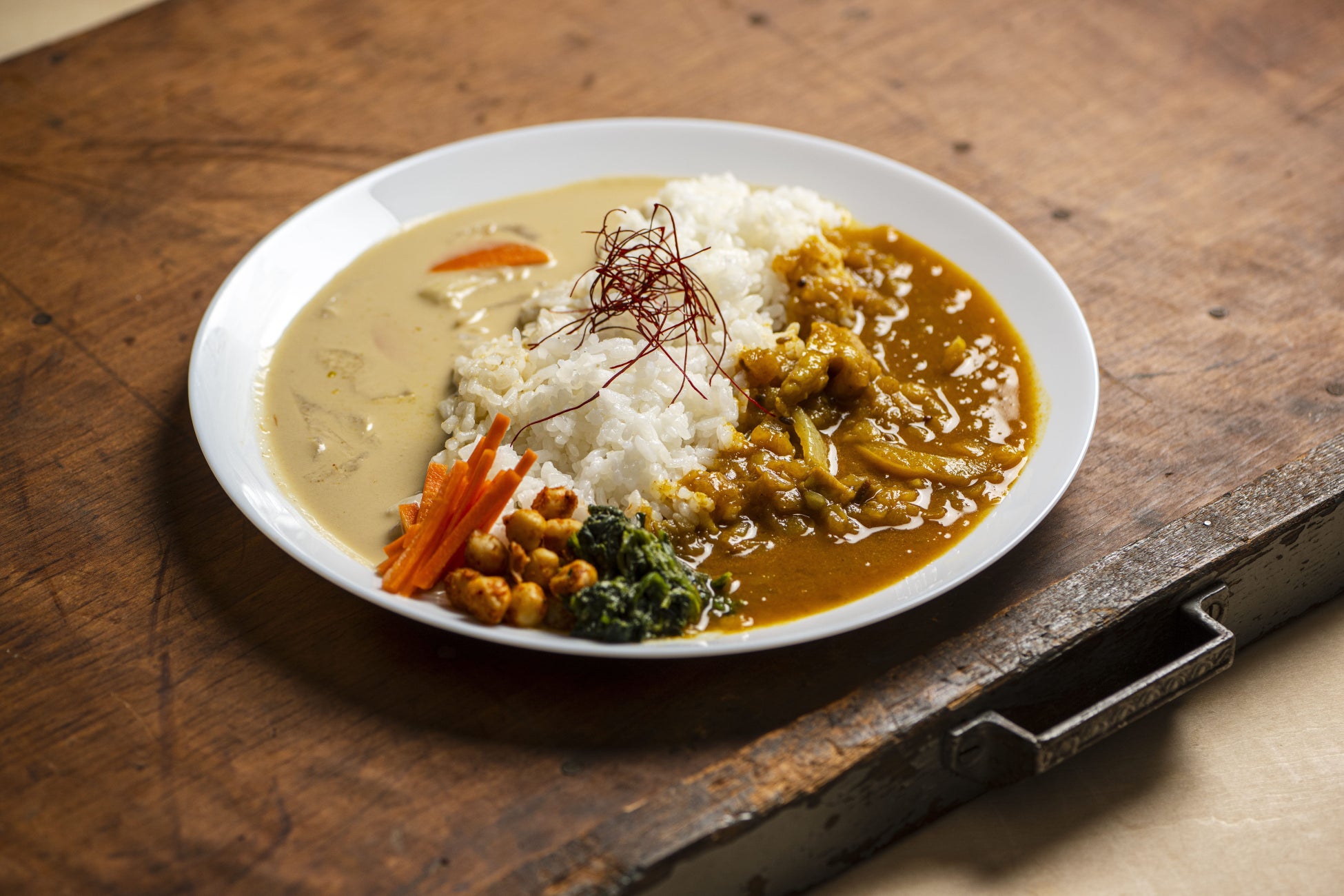 カレーは「牛すじかれー」「キーマカレー」「ココナッツカレー」「バターチキンカレー」「ザグカレー」「週替わりカレー」の6種類から2種類選んでいただけます。