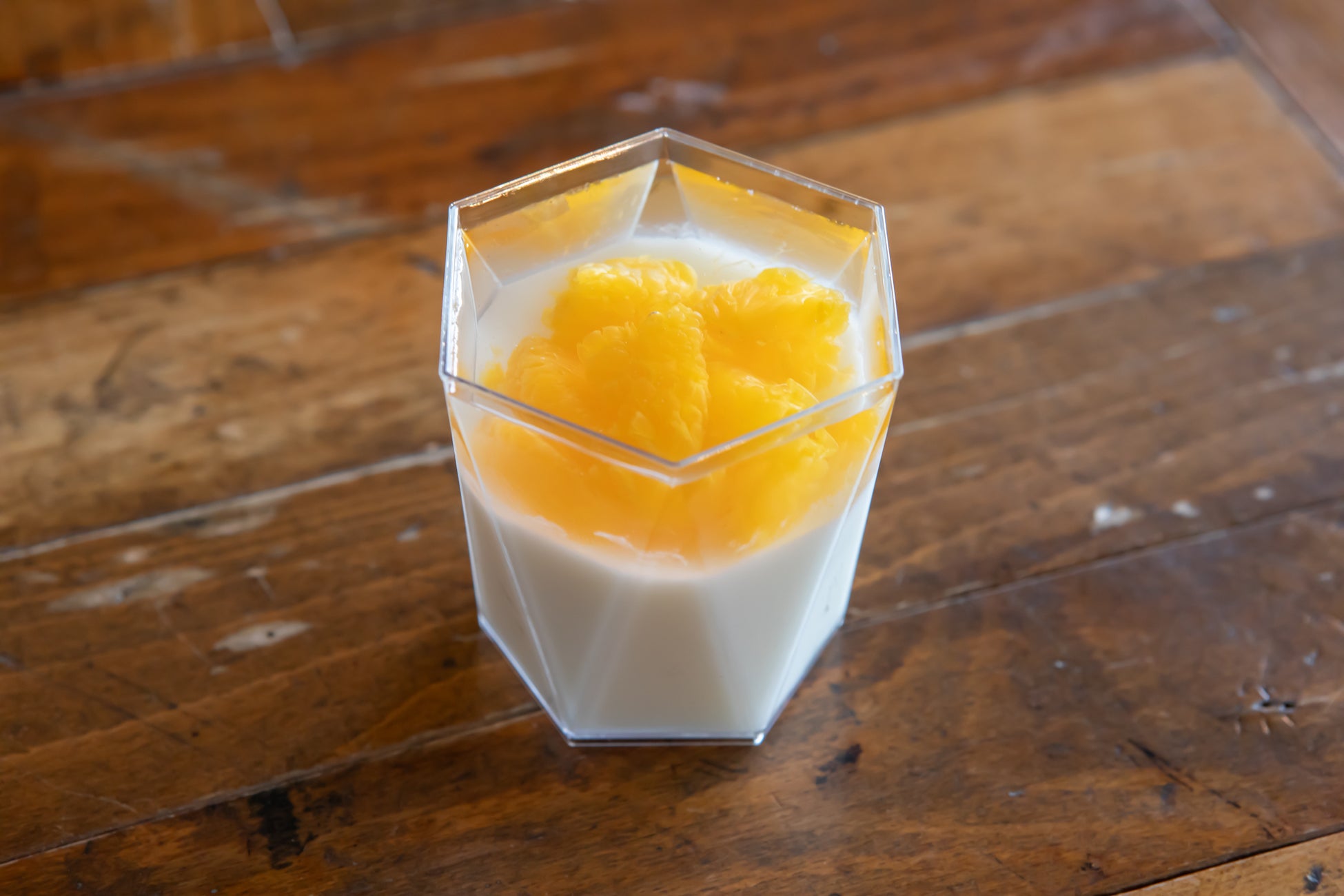 みかんをそのままミキサーにかけた贅沢なソースに、はちみつの甘さをプラス。みかんの果実も約2個分使用しています。すっきりとした甘さが暑い時期によく合う1品です。