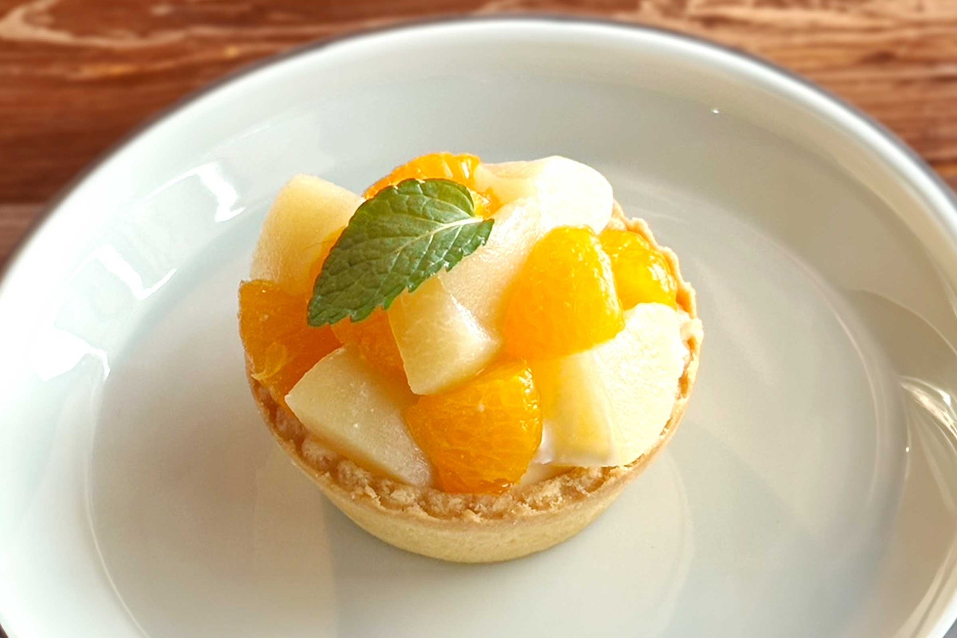 マスカルポーネチーズクリームと南濃みかん、白桃を飾ったタルト。生徒1人ずつが盛り付け方を考え、SNSで投票した結果この盛り付けになりました。