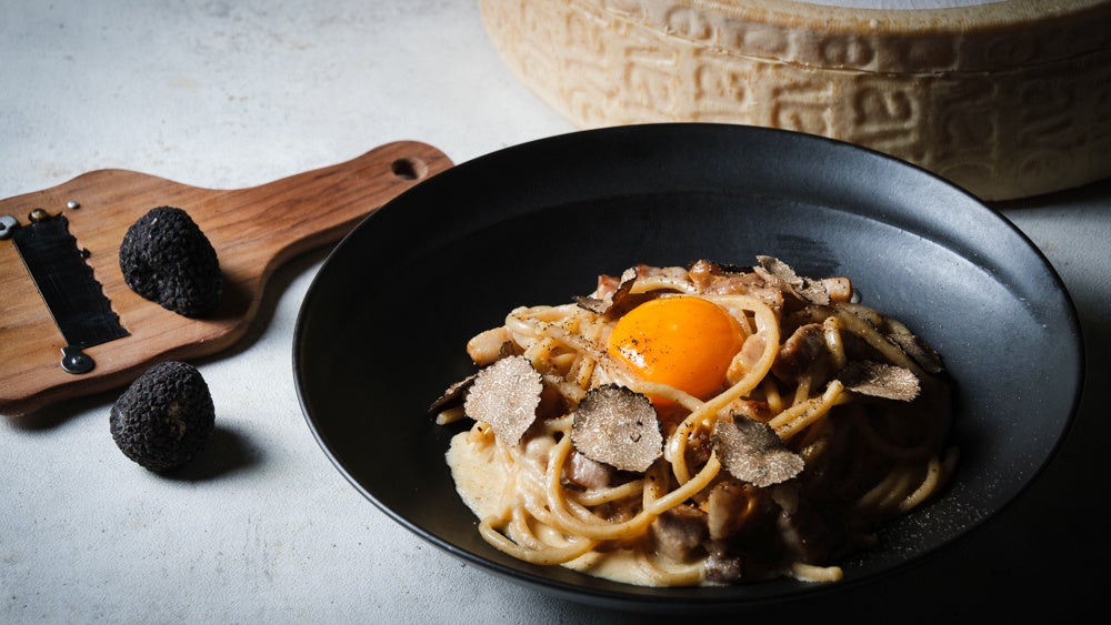 【パスタ】 Cheese Tavern CASCINA スペシャリテ 炎のパスタ 黒トリュフと熟成ベーコンキタッラカルボナーラ
