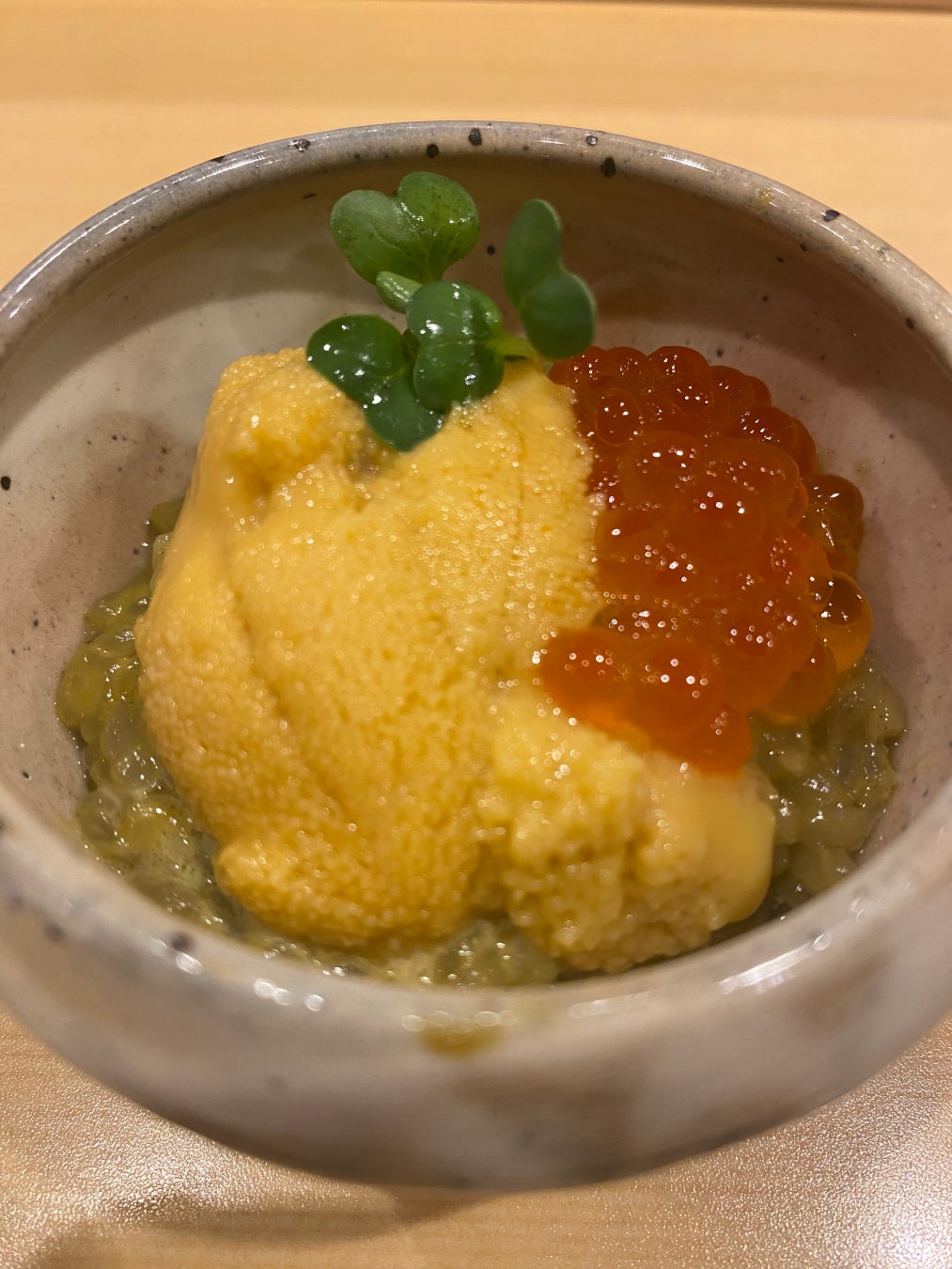 スペシャリテは『ウニ、イクラと鮑の肝ソースを使用した痛風リゾット』。ウニとイクラを贅沢に使用した、鮑肝ソースリゾットです。濃厚な鮑肝ソースを絡めたリゾットに、ウニとイクラをふんだんに乗せた一品。一度ご賞味ください。