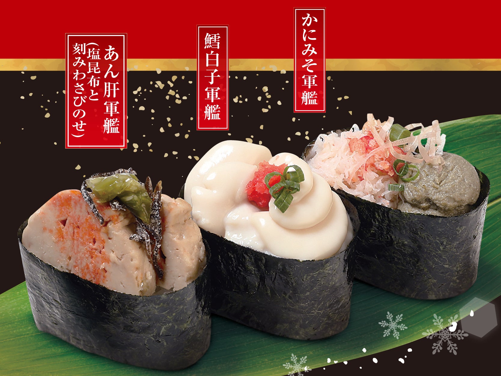 あん肝軍艦、鱈白子軍艦、かに味噌軍艦