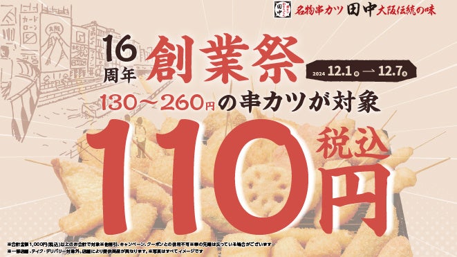 株式会社串カツ田中ホールディングス(本社:東京都品川区東五反田、代表取締役社長:坂本 壽男)が展開する「串カツ田中」は、2008年12月7日に第1号店である世田谷店を開店してから、今年で16周年になります。これまで応援してくださった皆さまへ感謝を込めて、2024年12月1日(日)から7日(土)までの7日間で、毎年恒例の創業祭を開催します。この期間は130円~260円以下の串カツ33種類を110円で提供します。