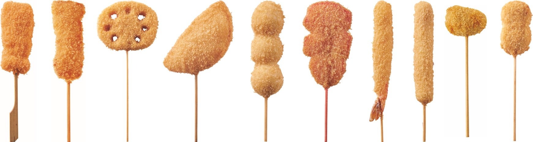 串カツ田中不動の人気No.1「串カツ豚」&人気No.2の「串カツ牛」はもちろん、大阪名物の「紅しょうが」、お子様に人気の「チーズ」や「エビ」などの定番串に加え、新メニューの「カニクリームコロッケ」や大好評のコラボメニュー「キット串カツ(キットカツ)~Made with KITKATⓇ~」など、33種類の串カツを110円でご提供します。