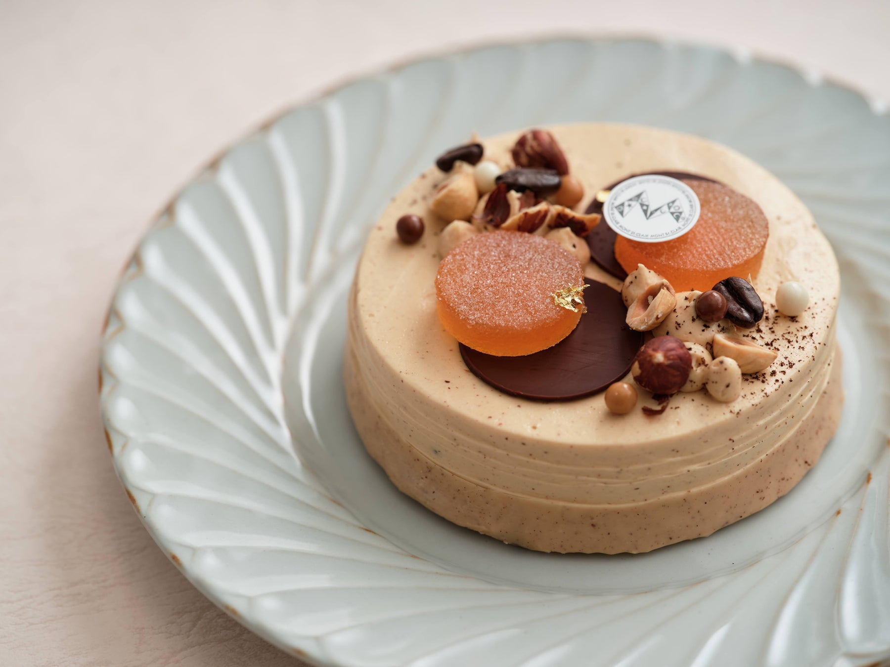 カカオ、ナッツ、カフェ、それぞれの素材が力強く響き合いながらも、互いの魅力を際立たせたバタークリームのガトー。