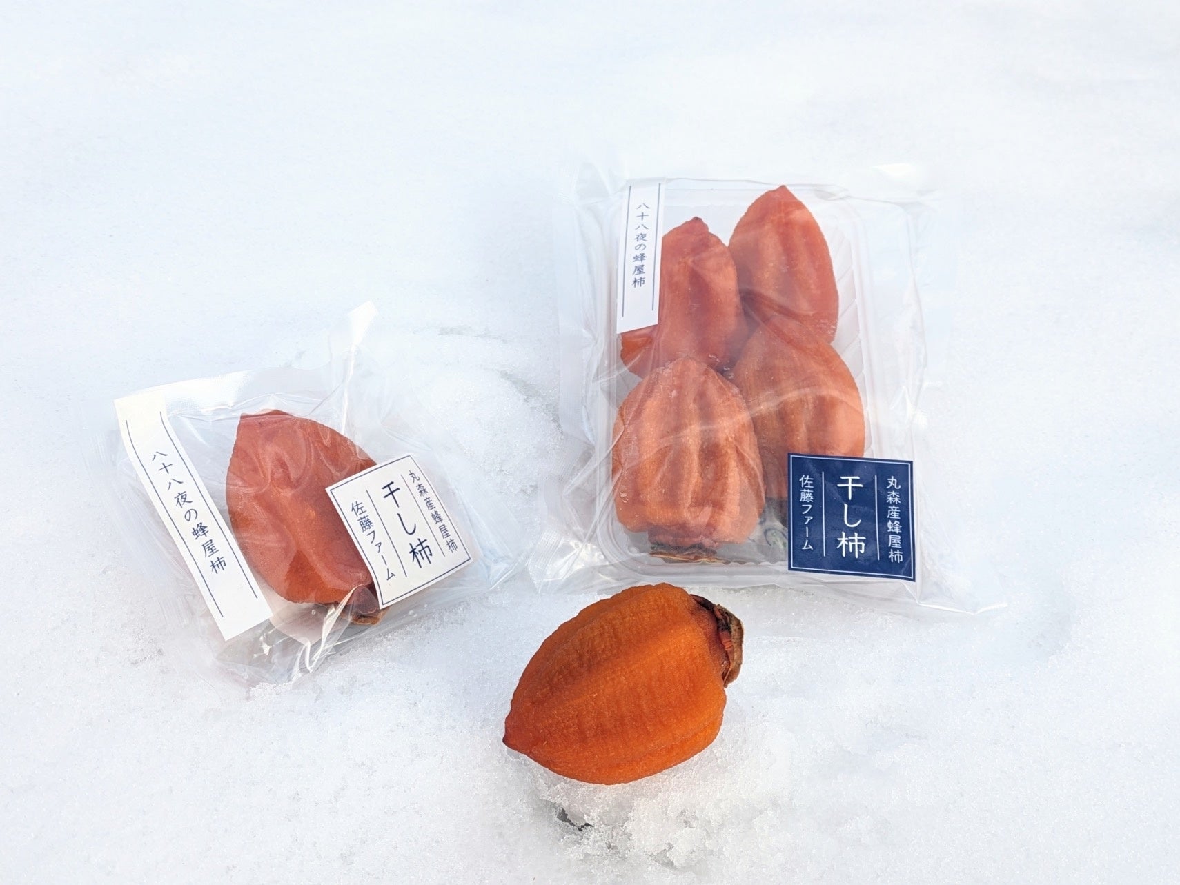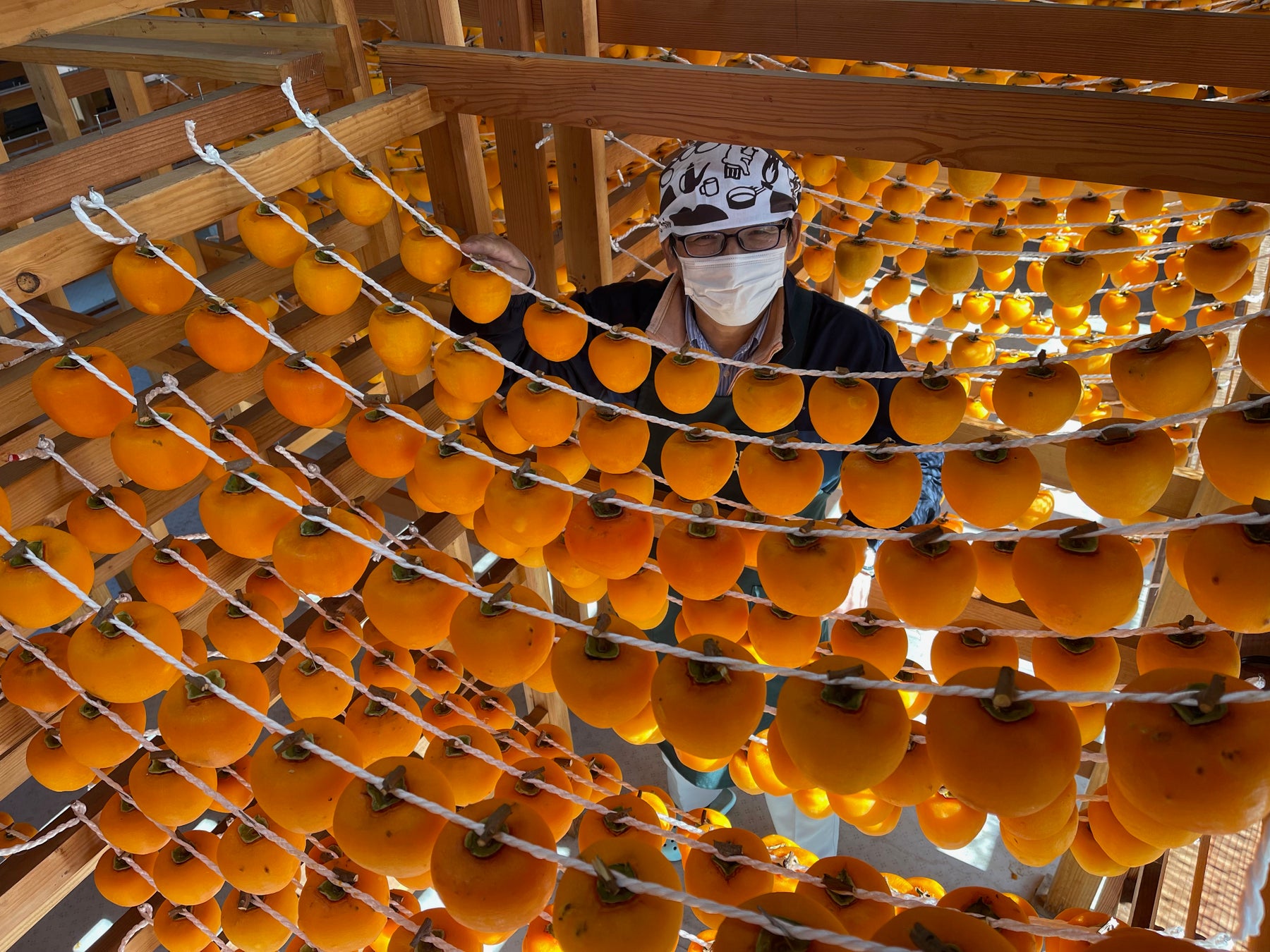 秋に収穫して皮をむき、丸森町の澄んだ空気での自然乾燥にこだわっています。店舗2階の柿干し場に吊るし、その数約3万個。丸森町の初冬の風物詩として毎年マスコミに取り上げられています。