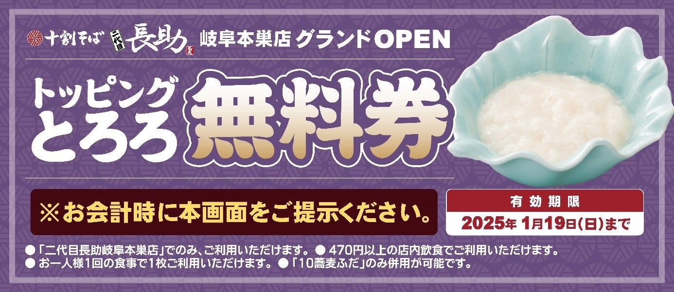 また、岐阜本巣店限定でご利用いただける「トッピングとろろ無料券」を記載いたしました。この画面を掲示で期限内、何度でもご利用いただけます。