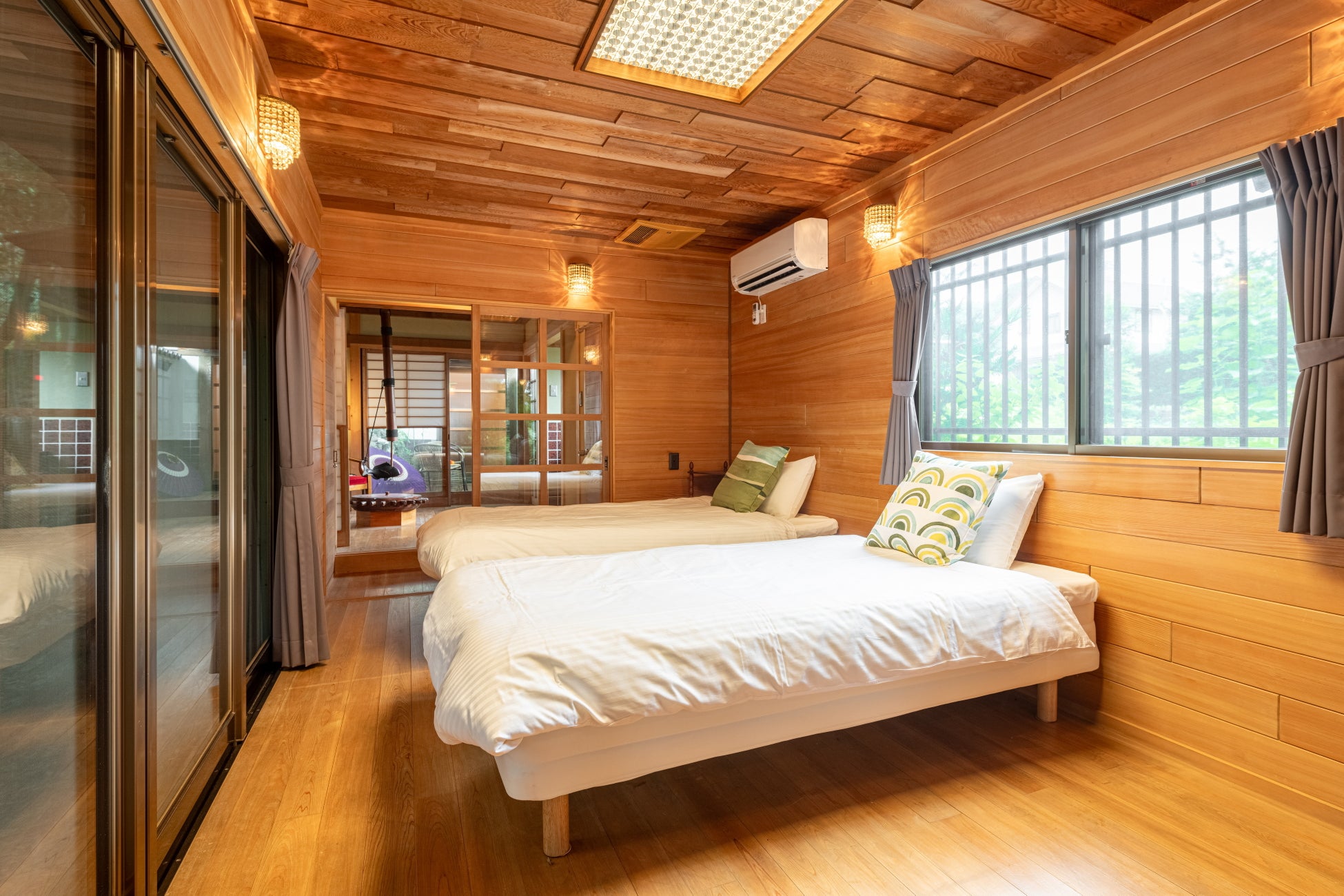 富士山本宮浅間大社の竹林に隣接しており、お部屋の中の移動の際に、自然の匂いや、風を、感じることができるようデザインされました。
