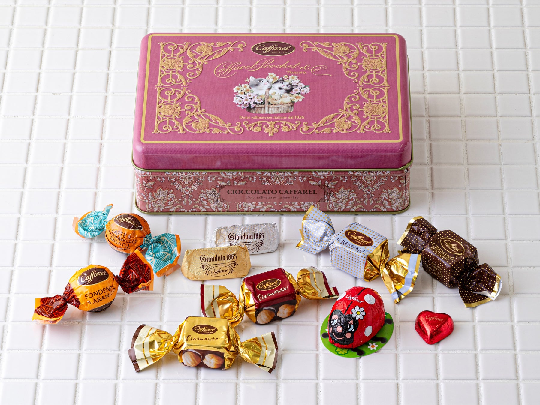 世界中にファンを持つ、トリノ発の老舗チョコレートブランドの「カファレル」。今年の一押しは、イタリアらしいゴシック模様に子猫やヒヨコが描かれたかわいいデザイン。中には、定番のヘーゼルナッツ香るジャンドーゥヤや人気のピエモンテ、ソルテッドキャラメルなどが入っています。