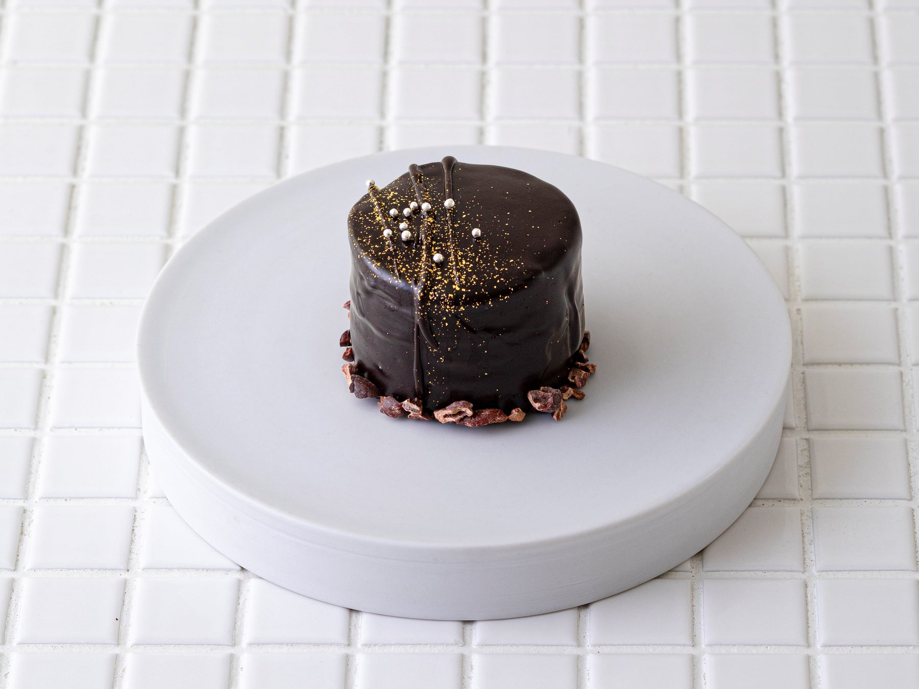 濃厚カカオと甘酸っぱいジャムが好相性。イタリアの伝統的なケーキをバレンタインに。カカオのグラサージュに金粉や銀のアラザンを飾った、見た目も豪華な一品。内側には、カカオのスポンジケーキを3層に重ね、間にあんずのジャムが入っています。果肉が残るジャムのほどよい酸味、足元に沿えたカカオニブの苦みもアクセントになり、深みのある味わいです。