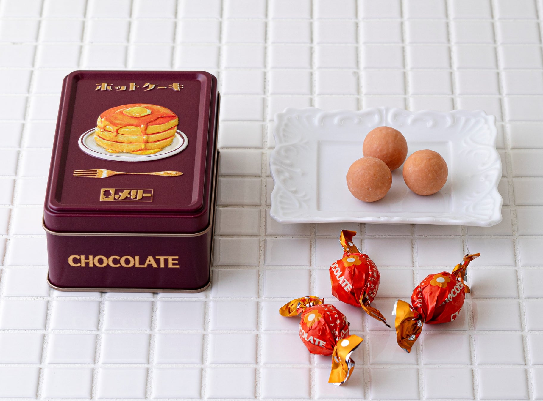 はじけるキャンディチョコレート。ホットケーキ缶 1缶(9粒入) 1,296円/メリーチョコレート
