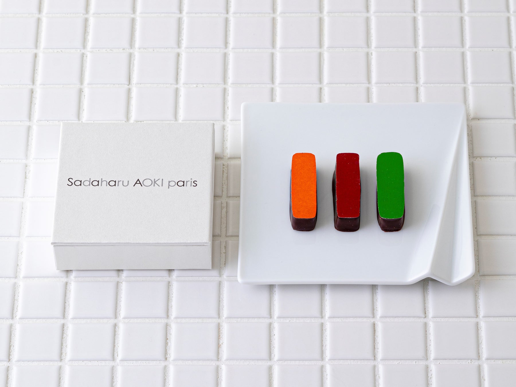 パリに本店を構える青木定治シェフの想いが詰まった、化粧パレットのようにカラフルなショコラ。全12種の中から特に人気が高い抹茶が香るバンブー、ほどよい酸味のフランボワーズとヴァランシアの3本を詰め合わせです。