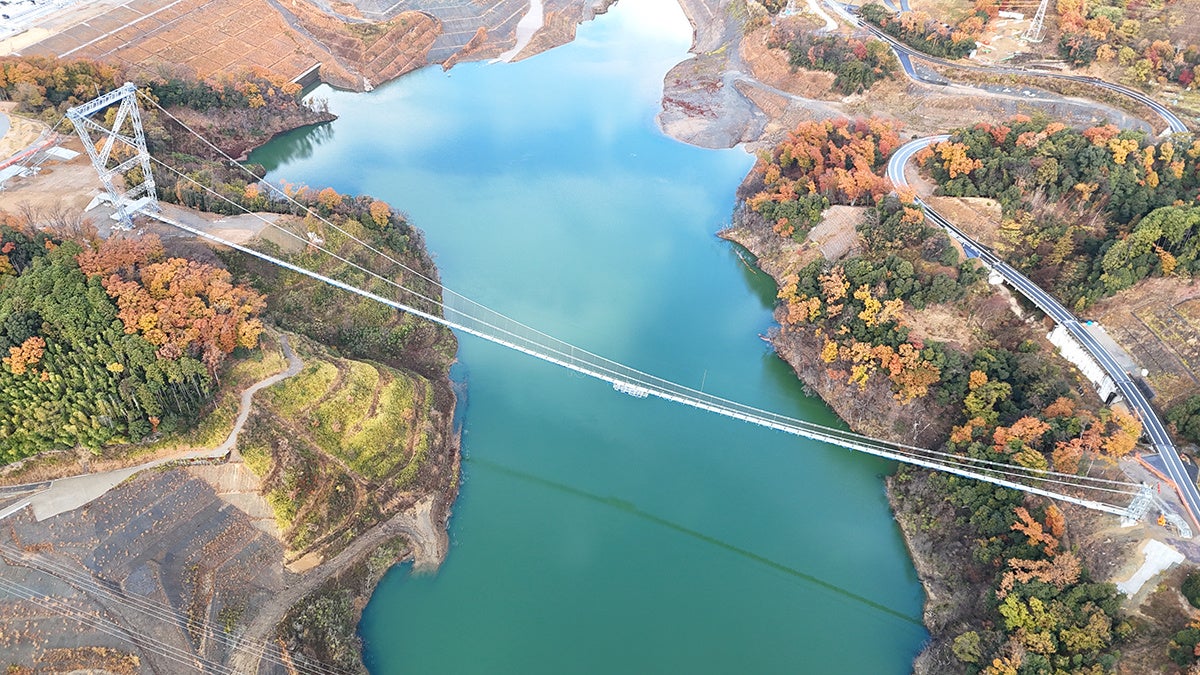 雄大な景色を眺めながら安威川ダムに架かる全⻑420メートルのつり橋を歩いて渡ります。