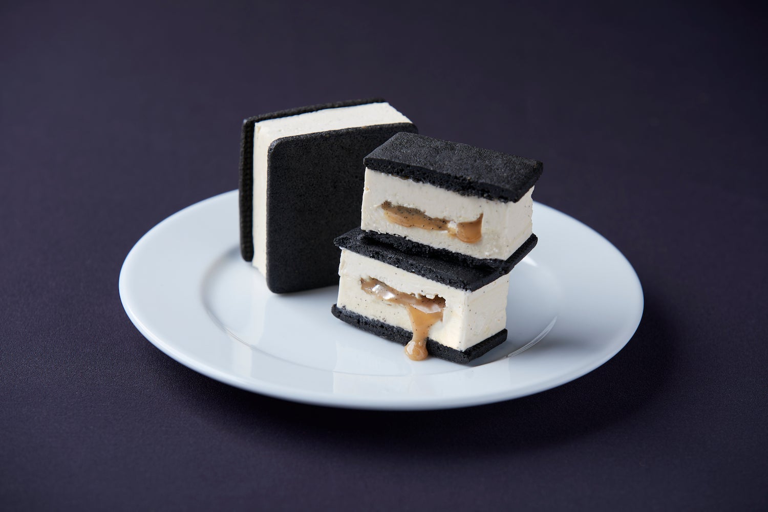 竹炭入りサブレで、タヒチ産バニラとバニラブランデー香るバタークリームをサンド。