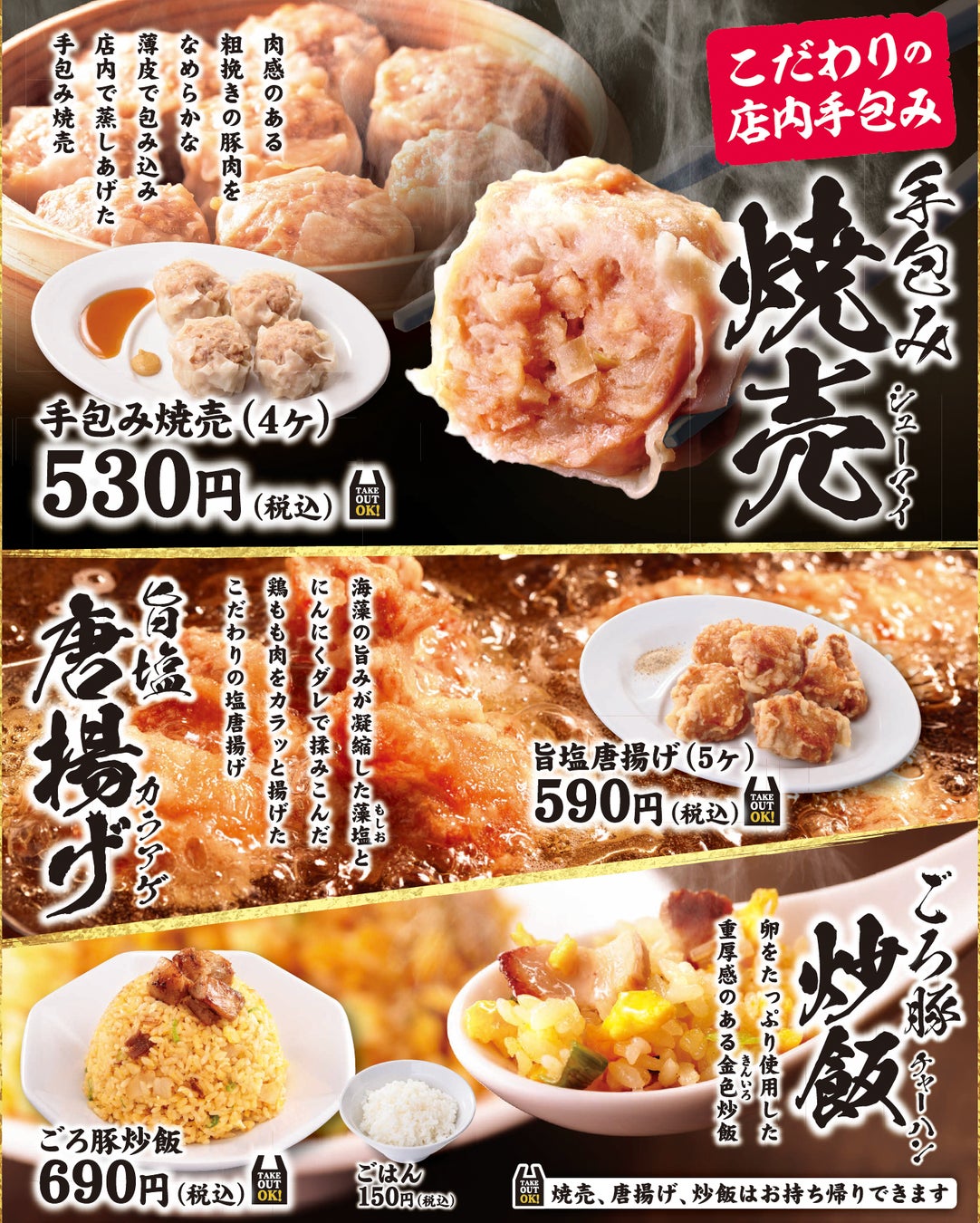 調理済みのサイドメニュー商品「しゅうまい」「唐揚げ」「炒飯」をテイクアウトすることも可能です。ぜひ、ご自宅でも「金ことぶき。」の味をお楽しみください。