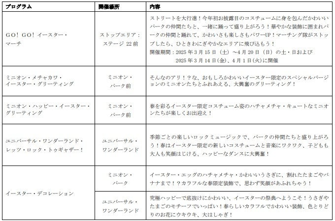 さらに、“はじめて”の冒険・刺激・熱狂の連続で、“宝もの”級の家族の思い出がつくれる場所として、数々の最新エンターテイメントに加え、“かわいい”に全身染まり、日常吹き飛ぶキュートな世界の連続に“究極ハッピー”になれるイースター・イベント『ユニバーサル・イースター・セレブレーション2025』【開催期間:2025年3月7日(金)~6月29日(日)】と、歌って踊って心の底から“超熱狂”できるストリート・ミュージック・フェス『レッツ・ロック!』【開催期間:2025年3月7日(金)より順次開始】を期間限定で開催します。