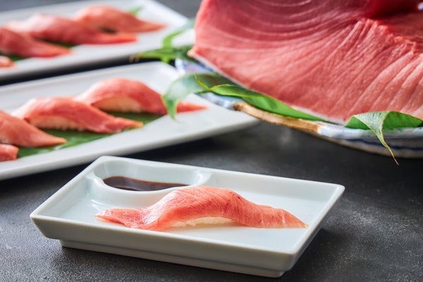 深い赤色の身と、美しい大理石模様のような脂の入り方が特徴で、ふくよかな味わいと、口の中でほどけるような舌触りの「黒潮本マグロ」をにぎり寿司でご用意いたします。
