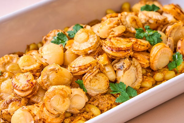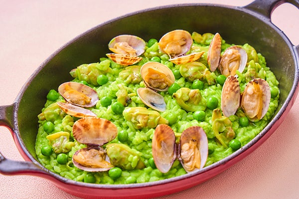 筍、菜の花、芽キャベツなど春の素材とともにポトフ風に仕立てた「ロールキャベツ・サルシッチャ」や、あさりをアクセントに旬のグリーンピースをふんだんに使用した緑が鮮やかに映える「グリーンリゾット」、春野菜を添えて提供する「旬魚のプランチャ」など、旬の野菜を用いた料理をご堪能ください。脂肪に変わる炭水化物の吸収を抑える働きがある白いんげん豆と帆立貝を合わせた、健康を意識したスパイス料理「白いんげん豆とスパイスの軽いラグー 帆立貝のパンソテー」もご賞味ください。