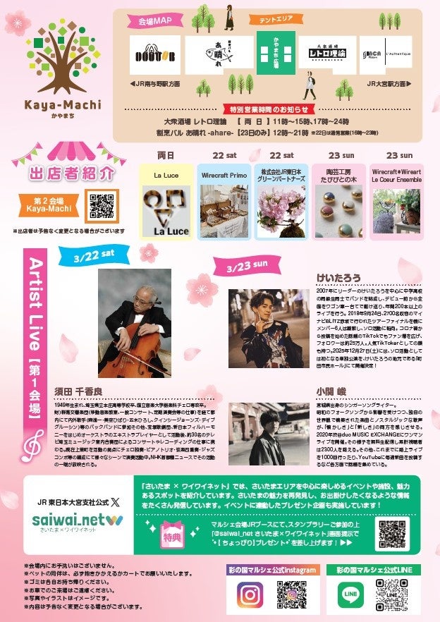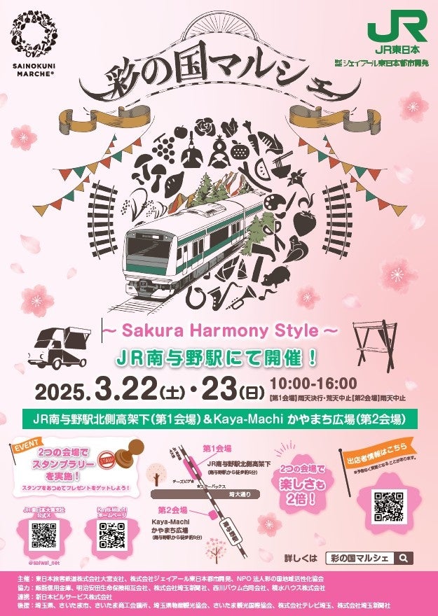 NPO法人 彩の国地域活性化協会(拠点:埼玉県さいたま市、代表理事:佐々木 輝伸)が主催する「彩の国マルシェ」は、2025年3月22日と23日の2日間、埼玉県さいたま市にあるJR南与野駅高架下にて「彩の国マルシェ~Sakura Harmony Style~」を開催いたします。