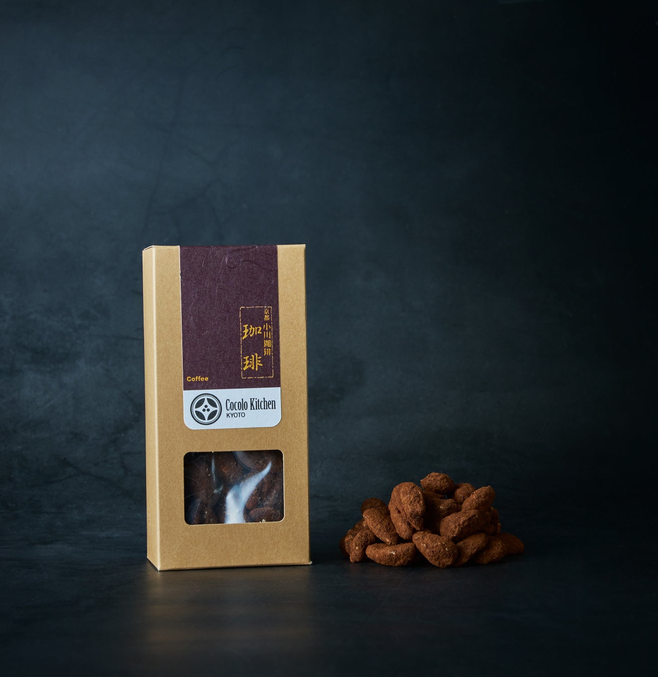 京都を代表する珈琲店の一つの「小川珈琲」とのコラボナッツです。世界各地から厳選した高品質な生豆を取扱っていますが、中でも有機JAS認証のコーヒー豆を使用し、しっかりと珈琲の味が楽しめるナッツに仕上げました。