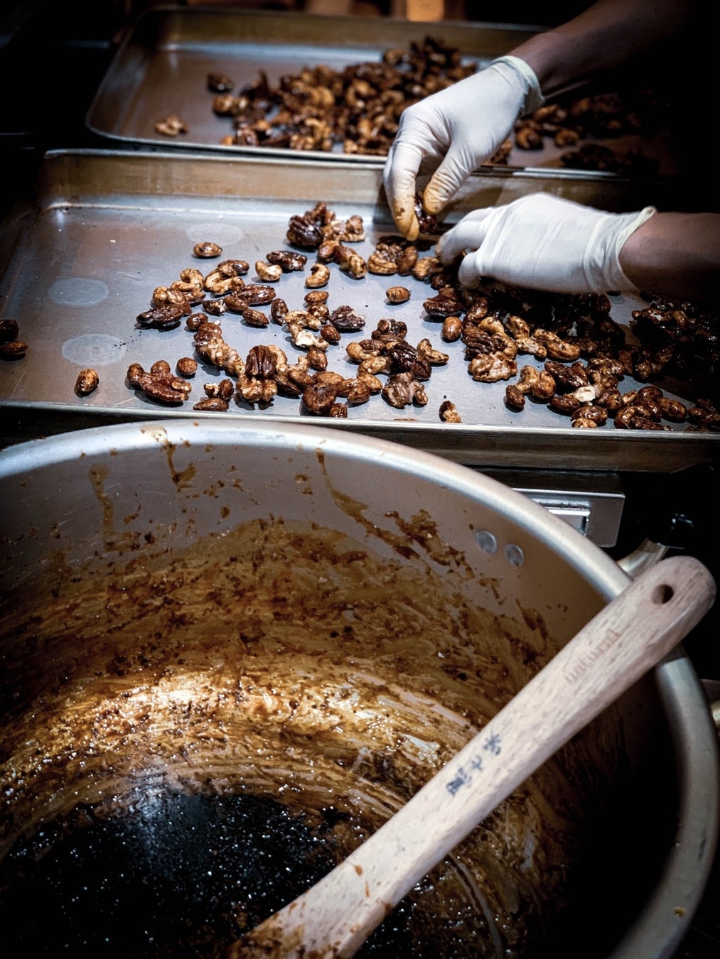 店舗が京都盆地の中にあることから、四季折々、昼夜、日々気温や湿度が変化しやすい環境にあります。ナッツ職人は、この変化を敏感に肌で感じ取り、経験に裏付けされた計算で、ナッツ一粒ひと粒に味をつけ、丁寧に焼いていきます。その高い技術や経験が、世界に二つとない豊かな味わいを生み出しています。