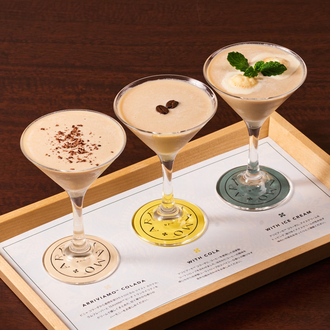 1階のメインバーからは、エスプレッソと日本で愛されてきたわらび餅や黒糖を合わせ、さらに米糀からできたミルクを使用した『米糀ミルク使用 黒糖 わらび餅 パフェ ラテ』、開発者がイタリアで出会ったミルクのジェラートにオリーブオイルとソルトを添えて楽しむスタイルから着想を得て、オリーブオイルのジェラートとコールドブリューコーヒーを合わせた新しい「オリアート™」、2階のティバーナ™ バーからは南国のリゾートで味わう贅沢な時間をイメージしたティービバレッジ『ティバーナ™ フローズン パイナップル コナ ポップ』、3階のアリビアーモ™ バーからは3種の異なるピニャコラーダのツイストカクテルを飲み比べできる『アリビアーモ™ コラーダ フライト』が登場します。