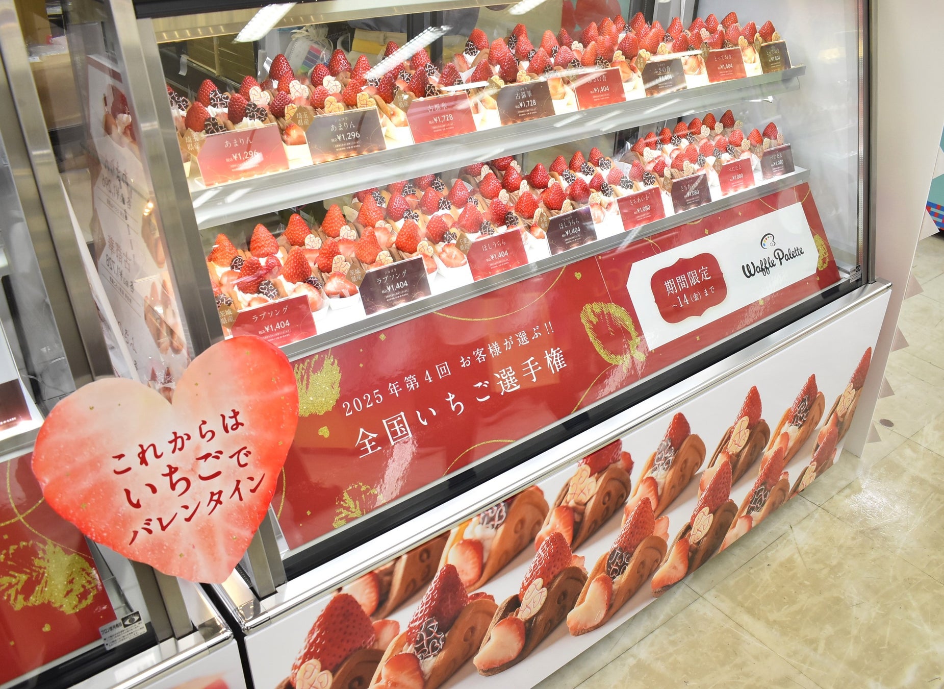 今年2月4日(火)から2月14日(金)までの11日間、京王百貨店新宿店7階大催場にオープンした「Waffle Palette -ワッフルパレット-」での特別企画。「Waffle Palette -ワッフルパレット-」は、コロンバンが展開するフルーツワッフルの専門店です。通常は様々な種類のフルーツを使ったワッフルをご提供しておりますが、2月の「Waffle Palette」は、「お客様が選ぶ!!全国いちご選手権」と銘打ち、旬のフルーツであるいちごに特化し、全てのワッフルをいちごで揃えて販売いたしました。