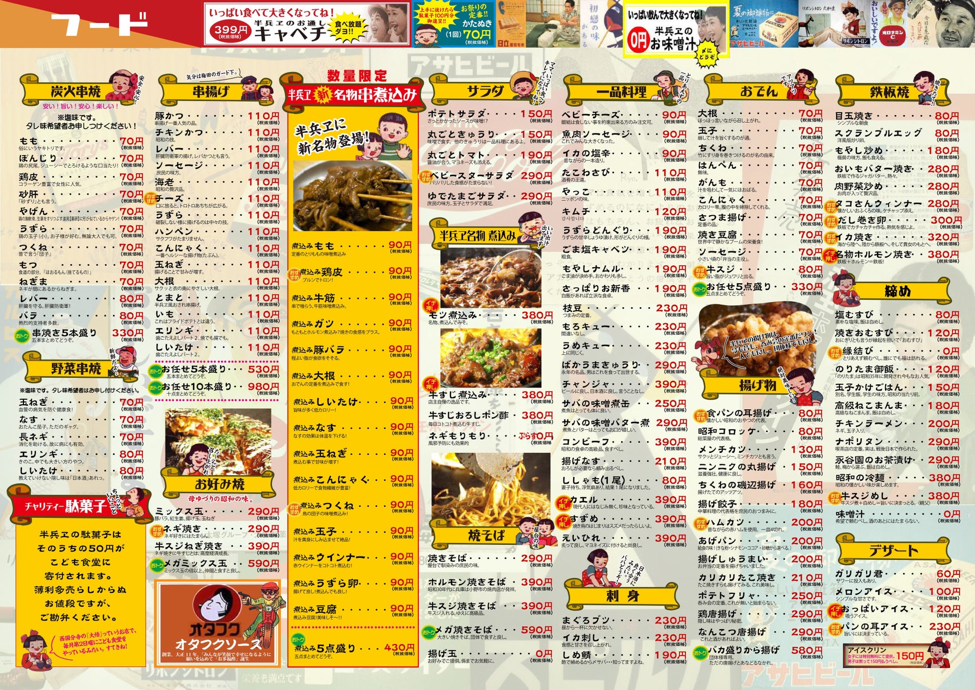 「儲けるべからず。潰すべからず。」の正直な商いを掲げる『薄利多賣 半兵ヱ』ならではのリーズナブルで懐かしいメニューに加え、『ガブ飲み処鬼ぞりゴリラ』や『居酒屋いくなら俺んち来い。』『Pecori』でお馴染みのファイブグループ流”「楽しい」で人と人をつなぐ”接客を融合し、地域に根ざした「馬場で一番楽しくて安いお店」を目指します。