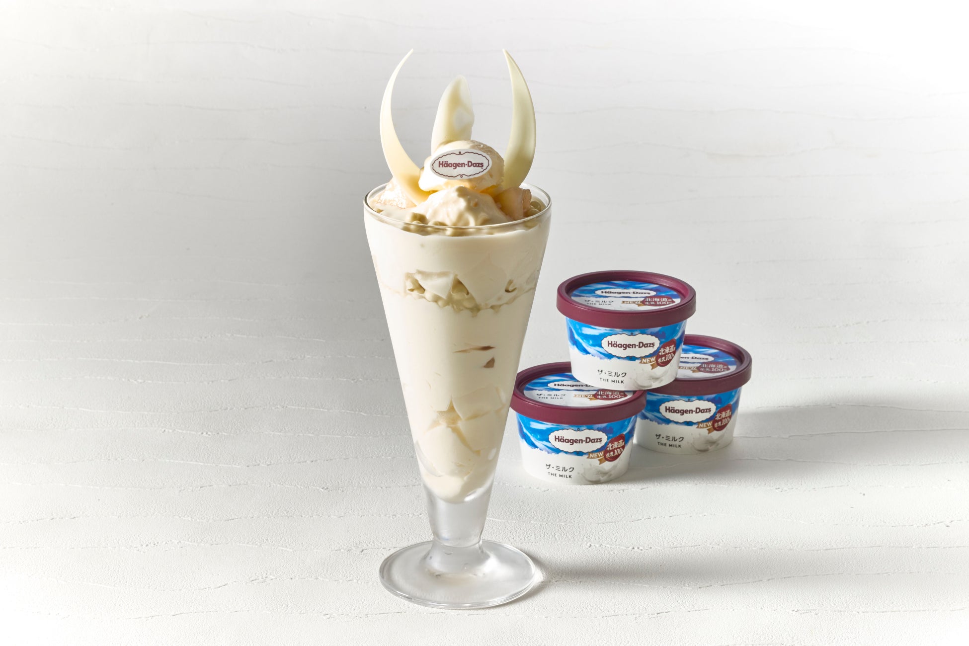 雪月花と名付けられたこのパフェは、濃いミルク味を感じながらも後味がすっきりとしたハーゲンダッツの新商品「ザ・ミルク」と定番「バニラ」2種類のアイスクリームを使用した真っ白なパフェ。パンナコッタとフロマージュムースを組み合わせ、中にはコンポートにした白桃のソースが隠れています。パールチョコレートの食感もアクセント。