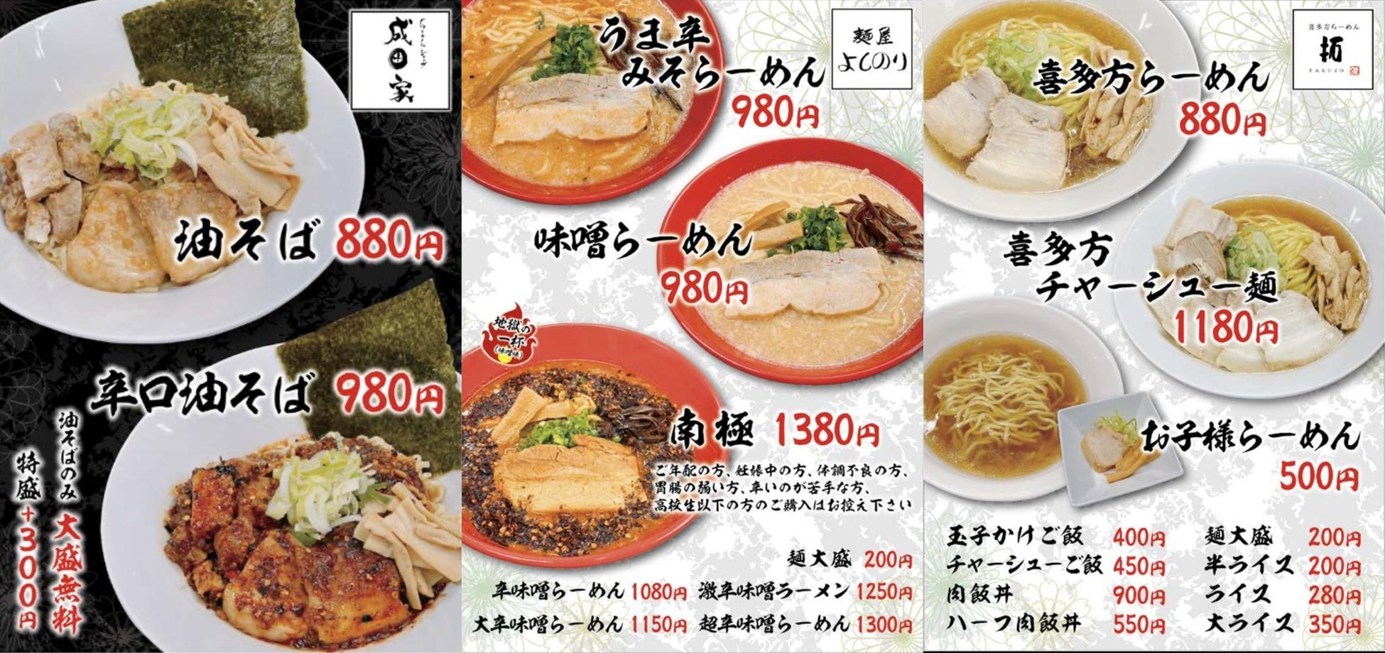 鎌ケ谷店では成田本店で人気の6店舗のうち「成田家」「麺屋よしのり」「喜多方らーめん拓(TAKUZO)」の3店舗が1つの店舗として出店いたします。フードコート形式により、お客様は3つの異なる味わいを手軽にお楽しみいただけます。